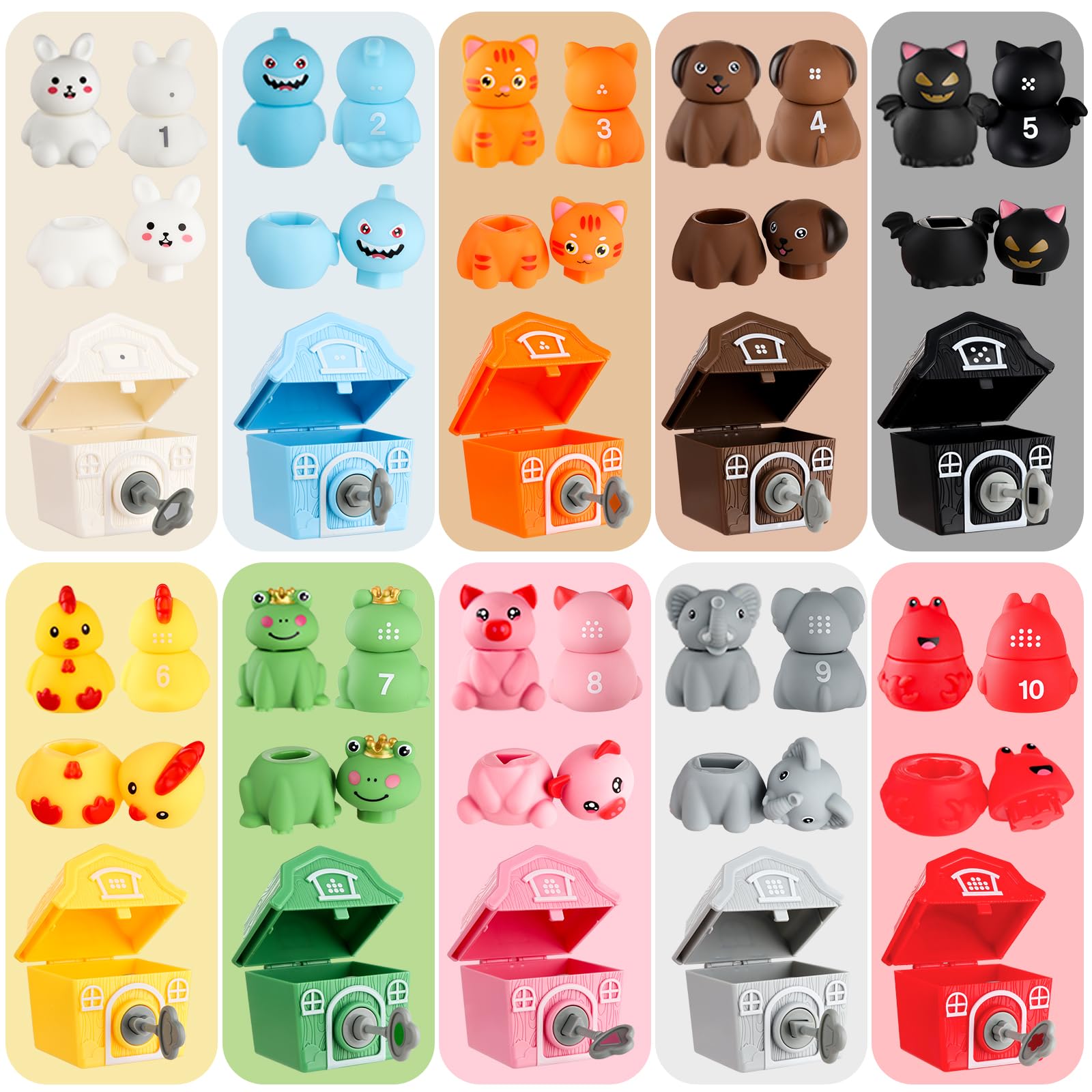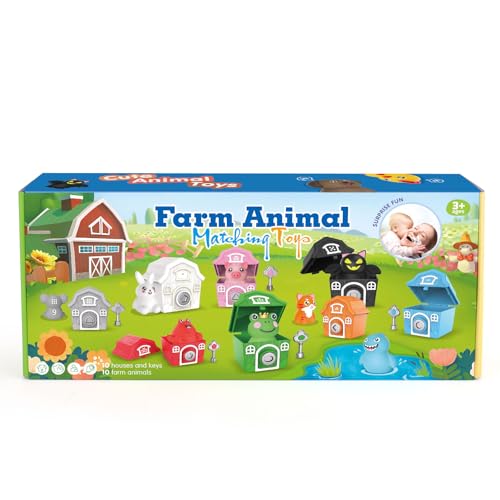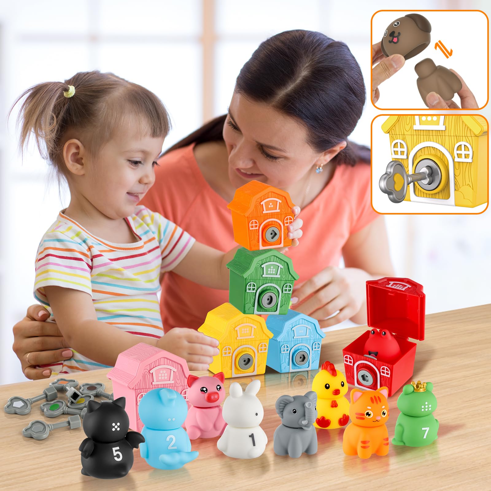 - Montessori Farm Animals: Our toddler learning toys set includes 10 different coloured barns and 10 animal dolls, each barn is equipped with a specific key to open it, 10 keys in total, and the animal toys are rabbits, cats, dogs, frogs, elephants and so on.