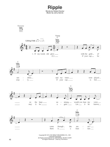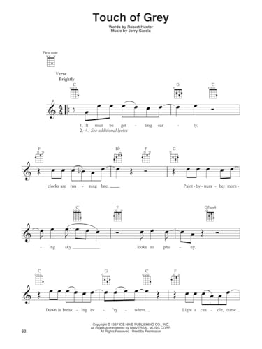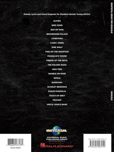 Grateful Dead Ukulele Songbook. * Play 20 of the Grateful Deads most beloved hits on ukulele with this officially licensed Hal Leonard collection. Featuring melody lines, lyrics, and chord diagrams for standard GCEA ukulele tuning, this songbook lets fans enjoy the iconic sound of the Dead in a format thats easy to learn and fun to play. * * Beginner-Friendly Format for Ukulele Players. * This softcover edition is ideal for players of all levels, especially beginners looking for accessible ukulele sheet music. With clear notation and standard chord diagrams, its designed to make playing along intuitiveeven for first-time players. A great music teacher resource for lessons and group practice sessions. * * Perfect Gift for Grateful Dead Fans and Ukulele Enthusiasts. * Whether youre a lifelong Dead Head or a ukulele beginner discovering the bands legendary catalog, this book makes a thoughtful gift for pianists or guitarists exploring a new instrument. A compact, collectible edition perfect for at-home practice, jam sessions, or sharing the joy of live music with others. * * Songs Included. * Althea * Bird Song * Box Of Rain * Brokedown Palace * Candyman * Casey Jones * Dire Wolf * Fire On The Mountain * Franklin’s Tower * Friend Of The Devil * The Golden Road * High Time * Ramble On Rose * Ripple * Rosemary * Scarlet Begonias * Sugar Magnolia * Touch Of Grey * Truckin’ * Uncle John’s Band.