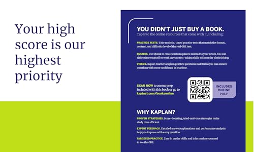 TRUST THE EXPERTS AT KAPLAN AND MASTER THE NEW 2-HOUR GRE Kaplan’s GRE Complete Ninth Edition is your comprehensive guide to acing the GRE. Get an advantage on test day with our three best-selling GRE books, one-year access to online practice, and expert test-taking strategies. Content review helps you boost your math skills and verbal proficiency, while six full-length tests help you practice your pacing so you can face the GRE test with confidence. We’ve been doing this for 80 years. We know what works. Prep with us and achieve your GRE goals. We’re so certain that GRE Complete Ninth Edition offers all the knowledge you need to excel at the GRE that we guarantee it: after studying with the online resources and books, you’ll score higher on the GRE–or you’ll get your money back. Included with the purchase of your book, you get: The Best Practice Attend live online class sessions taught by Kaplan experts Take five full-length online tests that match the same computer-based format you’ll see on test day. One full-length practice test included in the book for when online is not an option. Online resources including mini tests to help you get off to a fast start More than 2,500 practice questions with detailed explanations cover the Verbal, Quantitative, and Analytical Writing sections Video explanations of selected questions. Customize your practice with a 1000-question online Qbank that lets you select problems by topic and difficulty. Chapters on each GRE question type and math skill, with practice sets for each. Questions have been reviewed, revised, and updated by Kaplan’s expert faculty. Expert Guidance Online study-planning tool helps you target your prep no matter how much time you have before the test. We know the test: Our learning engineers have put tens of thousands of hours into studying the GRE, and we use real data to design the most effective strategy plans and study guides. Kaplan’s books and practice questions are written by veteran teachers who know students–every explanation is written to help you learn. We invented test prep–Kaplan (kaptest.com) has been helping students prepare for the GRE, GED, LSAT, ACT, MCAT, and other exams for over 80 year.