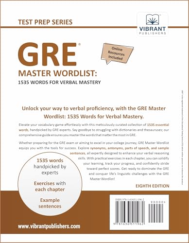 Are you gearing up for the GRE exam and feeling overwhelmed by the vast sea of words? Look no further! Introducing the ultimate solution to your vocabulary challenges – GRE Master Wordlist: 1535 Words for Verbal Mastery. Crafted by GRE experts with years of experience, this comprehensive guide is your ticket to mastering essential GRE vocabulary efficiently and effectively. No need to sift through endless dictionaries or struggle with thesauruses – we’ve done the hard work for you. Top 1535 words essential for GRE Synonyms and antonyms of each word to help bolster retention Parts of Speech: Understand how to use each word correctly in different contexts Sample Sentences: See the words in action and grasp their real-world applications What’s inside? Each chapter comes with a set of three skillfully designed exercises. Solidify your understanding, track your progress, and address areas that need extra attention. Mastering these 1535 words not only ensures success on the GRE exam but also equips you for success in your college program and beyond. Strengthen your communication skills and enrich your language proficiency for life’s diverse challenges. The purchase of this book comes with additional online resources to help you get the better of the stress that you might face during preparation, and also help you come up with a routine to help you scale the entire syllabus whilst helping you practice your concepts. Don’t let vocabulary hurdles hold you back. Elevate your verbal reasoning, excel on the GRE General Test, and thrive in your academic and professional pursuits with GRE Master Wordlist, your ultimate vocabulary guide. Unlock the doors to linguistic mastery today!