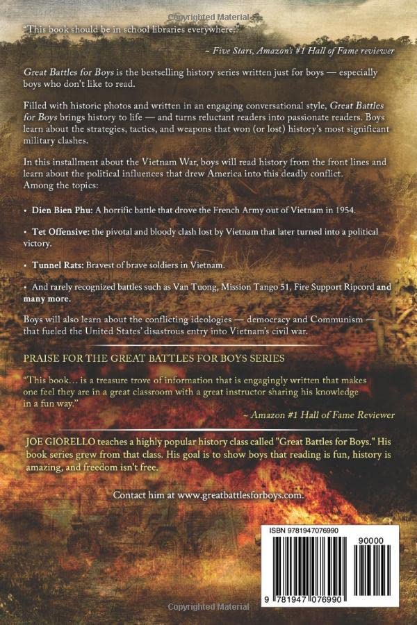 Great Battles for Boys — the bestselling series written just for boys, especially boys who hate to read! From first-person accounts to front-line battlefield action reports, boys will learn about the Vietnam War, including the politics that sent American soldiers into this deadly and disastrous conflict. Written in an engaging style and with dozens of historical photos, Great Battles for Boys captivates even the most reluctant readers. Boys learn about the military strategies, tactics, and weapons that won (or lost) the most significant battles of world history. Chapters include: The Battle of Dien Bien Phu: The 1954 fight that pushed the French Army out of Vietnam. The Tet Offensive: the pivotal and violent clash that the North Vietnamese lost but later turned into a political victory. Tunnel Rats: How the bravest soldiers survived Vietnam’s treacherous tunnel systems. Plus rarely recognized battles such as Van Tuong and Fire Support Base Ripcord. Boys also learn about the difference between democracy and Communism, and how that difference helped fuel the United States’ entry into another country’s civil war. PRAISE FOR GREAT BATTLES FOR BOYS: “This book… is a treasure trove of information that is engagingly written that makes one feel they are in a great classroom with a great instructor sharing his knowledge in a fun way.” — Amazon #1 Hall of Fame Reviewer