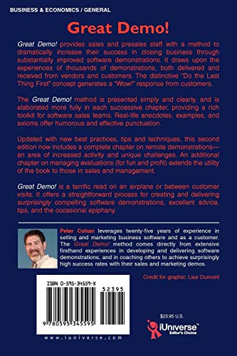 Great Demo! provides sales and presales staff with a method to dramatically increase their success in closing business through substantially improved software demonstrations. It draws upon the experiences of thousands of demonstrations, both delivered and received from vendors and customers. The distinctive “Do the Last Thing First” concept generates a “Wow!” response from customers.The Great Demo! method is presented simply and clearly, and is elaborated more fully in each successive chapter, providing a rich toolkit for software sales teams. Real-life anecdotes, examples, and axioms offer humorous and effective punctuation.Updated with new best practices, tips and techniques, this second edition now includes a complete chapter on remote demonstrations-an area of increased activity and unique challenges. An additional chapter on managing evaluations (for fun and profit) extends the utility of the book to those in sales and management.Great Demo! is a terrific read on an airplane or between customer visits. It offers a straightforward process for creating and delivering highly compelling software demonstrations, excellent advice, tips, and the occasional epiphany.