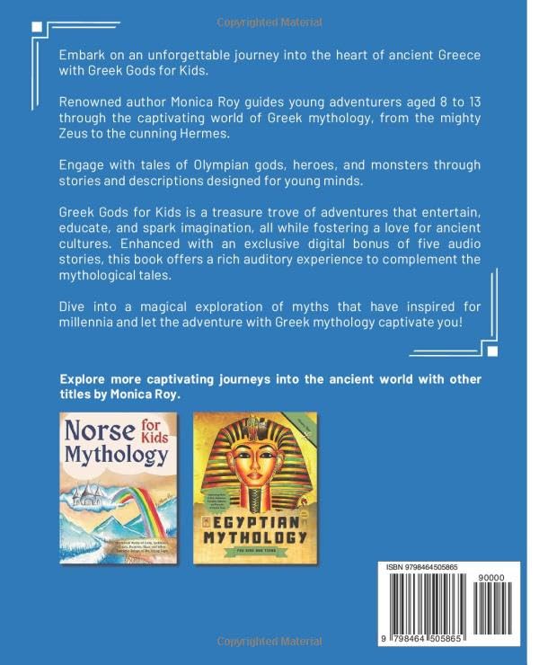 Dive into the heart of ancient Greece with Greek Gods for Kids, a multi-sensory exploration through the myths and legends that have shaped storytelling for millennia. Now with an interactive VIDEO & AUDIO Experience: Jumpstart your child’s adventure into Greek mythology with exclusive AUDIO and VIDEO bonuses! These engaging multimedia enhancements captivate young minds, sparking a passion for reading through the vivid retelling of timeless tales. Authored by the renowned Monica Roy, this book invites young explorers aged 8 to 13 to discover the vibrant world of Greek mythology, now vividly brought to life through beautifully illustrated stories that fill each page with color and excitement. As children turn each page, they’ll be greeted with a visual feast that transforms ancient tales into immersive experiences. The illustrations are a tapestry of bold hues and dynamic artistry, capturing the essence of each deity and hero with a modern twist that resonates with young readers. Greek Gods for Kids unfolds the fascinating world of gods and goddesses, heroes and monsters, offering a treasure trove of adventures that not only entertain but also impart valuable lessons. Monica Roy, with her extensive background in mythology and a prolific portfolio that includes engaging narratives on Egyptian and Norse myths, crafts each tale with care, ensuring that the ancient world is accessible and engaging for a young audience. By exploring “Greek Gods for Kids,” your child will: Develop a love for reading as they’re captivated by the seamless blend of engaging storytelling and stunning artwork, enhancing their literacy skills and enriching their vocabulary. Learn timeless character traits like courage, intelligence, and resilience as they follow the adventures of iconic figures from ancient lore. Ignite their creative thinking, laying the foundation for a lifelong appreciation of literature and the arts. Gain insights into ancient Greek culture and history, fostering a deeper understanding of the world’s heritage. Exclusive VIDEO & AUDIO Bonuses: This edition includes five AUDIO stories and a special VIDEO ANIMATION of the myth of Aphrodite, enhancing the reading experience and bringing the words of the book to life with stunning visuals. The table of contents reveals a curated selection of myths, including: The origins of Greek mythology and the celestial hierarchy of Olympus. Intriguing tales of Zeus, Hera, Poseidon, and other Olympian deities, each story revealing the gods’ powers, adventures, and the moral lessons they convey. Heroic myths such as the valor of Heracles and the cunning of Hermes. Captivating stories of love, betrayal, and triumph, including the tales of Persephone, Psyche and Eros, and Orpheus and Eurydice. Comparative insights into Greek and Roman mythology, offering a broader understanding of ancient cultures. Adaptive Learning Experience: Greek Gods for Kids embodies the principles of the VARK learning styles–Visual, Auditory, Reading/Writing, and Kinesthetic. This book is meticulously crafted to cater to each style. With engaging audio narrations, visually stunning video animations, and richly detailed illustrations, it ensures every type of learner finds a connection. Invite your child to step into this magical realm where the mythical and the historical come alive with a radiance that leaps off the page. Let your child discover the wonders of Greek mythology with Greek Gods for Kids. Click Buy Now and let your child be the hero of their own epic tale, accompanied by the gods and goddesses of ancient Greece.