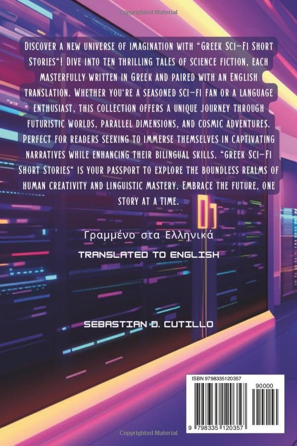 Unlock the future of storytelling with “Greek Sci-Fi Short Stories: 10 Short Stories written in Greek with English Translations”! This captivating collection in color features ten mesmerizing science fiction tales, written in Greek with English translations, perfect for both sci-fi enthusiasts and language learners. Immerse yourself in futuristic adventures, explore parallel universes, and experience the thrill of cosmic mysteries while enhancing your bilingual skills. Designed specifically for adult language learners, this dual-language book offers a seamless blend of entertainment and education. Each story is presented in Greek with a corresponding English translation, allowing you to expand your vocabulary, improve your comprehension, and enjoy the rich narrative without missing a beat. Ideal for those passionate about science fiction and eager to master the Greek language, “Greek Sci-Fi Short Stories” provides an engaging and immersive learning experience. Whether you’re an advanced student or just starting your bilingual journey, this collection will transport you to new worlds while boosting your language proficiency. Embrace the future of language learning with “Greek Sci-Fi Short Stories”. Dive into the unknown, enhance your skills, and discover the limitless possibilities of bilingual storytelling. Get your copy today and start your adventure!