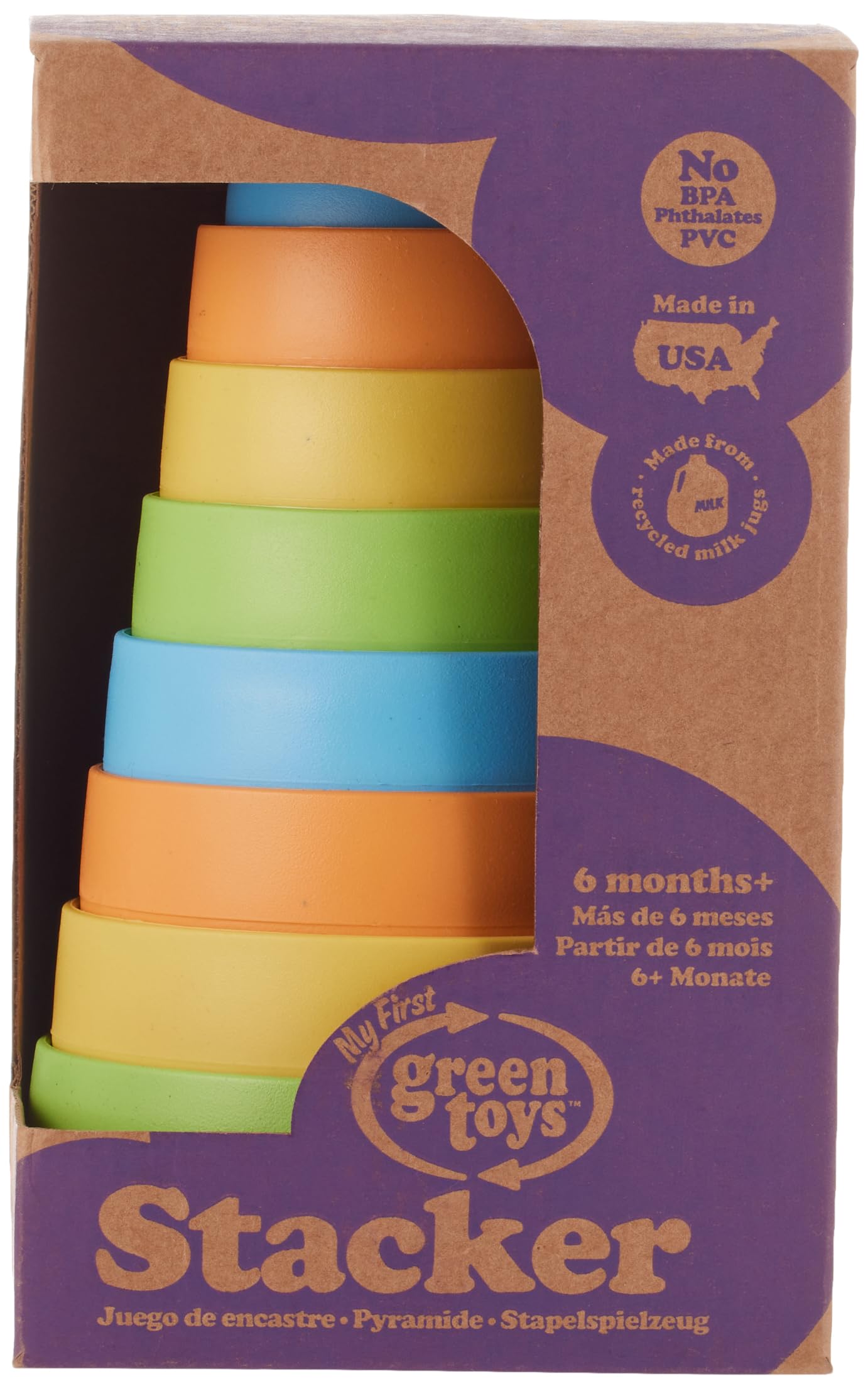 The Green Toys(tm) Stacker takes a classic toy and makes it safer and more playful. The eight whimsically colored nesting pieces stack easily from large to small, while also allowing little builders to use their imagination and stack in any order. Little ones can develop hand-eye coordination and color recognition while having plenty of Good Green Fun(tm). Most importantly, the Green Toys Stacker is safe. Its unique design has no center post. No BPA, PVC, phthalates, or external coatings. This Stacker is made in the USA from 100% recycled plastic which save energy and reduce greenhouse gas emissions. Packaged using only recycled and recyclable materials and printed with soy inks.
