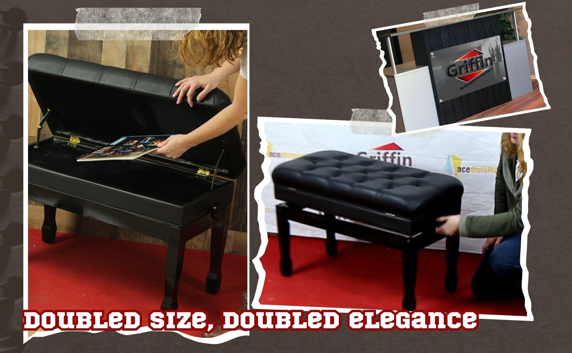 - 100% GENUINE LEATHER & OVER SIZED 2 PERSON SEAT TOP – DUET PIANO BENCH WITH STORAGE: To perform, you must be comfortable. That’s why the Griffin adjustable genuine leather piano seat is here to help you relax. The seat top is a very thick 3.5″ comfortable seat top that is 31.5″ wide by 15″ deep which is covered by 100% genuine leather with 13 buttons deep diamond tufted padded seat. Additionally, the seat top is a generous 31.5″ wide, making it possible to use as a 2 person duet seat top.
