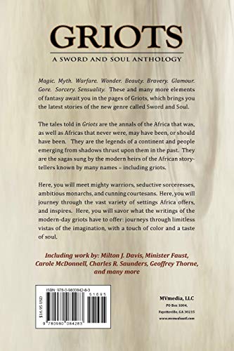 Magic. Myth. Warfare. Wonder. Beauty. Bravery. Glamour. Gore. Sorcery. Sensuality. These and many more elements of fantasy await you in the pages of Griots, which brings you the latest stories of the new genre called Sword and Soul. The tales told in Griots are the annals of the Africa that was, as well as Africas that never were, may have been, or should have been. They are the legends of a continent and people emerging from shadows thrust upon them in the past. They are the sagas sung by the modern heirs of the African story-tellers known by many names – including griots. Here, you will meet mighty warriors, seductive sorceresses, ambitious monarchs, and cunning courtesans. Here, you will journey through the vast variety of settings Africa offers, and inspires. Here, you will savor what the writings of the modern-day griots have to offer: journeys through limitless vistas of the imagination, with a touch of color and a taste of soul.