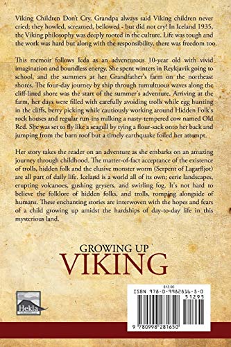 Ieda Jonasdottir grew up in Iceland,in a country where Viking philosophy, trolls, hidden folk and the elusive monster worm, the Serpent of Lagarfljot, were all accepted as existing without question. It was a life of daily hardship, but also of freedom to live as children should. Amidst the eerie landscapes, erupting volcanoes, gushing geysers and swirling fog, Ieda was allowed to grow up and learn the lessons of life without outside interference. But with a distant war, came visitors and new opportunities. A chance meeting, a proposal of marriage and a long journey by ship found Ieda landing at the Ellis Island of 1945. Now, she retells the story of her childhood growing up in the Iceland of 1935, when summer adventures were all that mattered, through immigration to the United States and a new life that was fully lived and filled with children, grandchildren and great-grandchildren. Growing Up Viking is a beautifully crafted memoir which looks back at Idea’s life in a simpler time and of the folklore, enchanting legends and Viking myths that shaped Iceland and helped to form her young mind. With interesting footnoteson the effects of the war and of the Dalvik earthquake of 1934, it is a story of a woman who lived for 65 years of her life in a vastly different culture, but who always remained a Viking at heart.