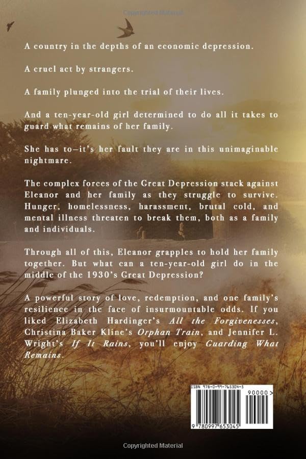 Eleanor’s heart quickened at Teddy’s menacing growl. She dropped next to the tri-colored Australian Shepherd and soothed his bristling fur. She followed his gaze into the pines. “What do you see there, boy?” He growled again and bared his teeth, eyes focused on something in the woods. Little does Elanor know the evil hiding in the woods that morning. But hours later, in the hot morning sun, as she and her family gather hay for their dairy farm, plumes of smoke rise in the distance. They arrive to find their large log home and barn fully engulfed in flames. Their savings, hidden in a milk can–gone. And so is Teddy! It is the Summer of 1931, the Great Depression is in full swing, and millions of people are out of work. Two weeks after the fire, Eleanor and her siblings help her father load the farm truck with donations of food and clothes from neighbors and friends, and mattresses purchased from the sale of milk cows. After one last stop at the farm, they head to the big city. Over the next year, Eleanor battles guilt for what she saw, but didn’t stop. As her mother sinks into depression, Eleanor is determined to guard what remains of her family. She works to help provide food and clothing as they face homelessness, bitter cold, and discrimination. “This one of those stories that reaches out and tugs at your heart…a novel that is good for your soul…” Panner, Bookbub If you liked Kristin Hannah’s The Four Winds, Christina Baker Kline’s Orphan Train, and Elizabeth Hardinger’s All the Forgivenesses, you’ll enjoy Guarding What Remains. Buy Now! What readers are saying about Guarding What Remains: “…an unforgettable read!” “…a powerful story of pain and forgiveness, human frailty and resilience, temptation and grace, hopelessness and steadfast love.” “…I couldn’t put it down…” “Poignant. Heart wrenching. Must read.” “…What a roller coaster ride of emotions…such a full, rich story…” “A beautiful and well-researched novel of the Depression…” “…This bookoffers hope in the midst of life’s struggles…” “…. I laughed, cried, cheered and pondered my faith…” “The author reels you in from the start and does not let go until the last page. A great variety of believable characters that you can’t help but root for them…”