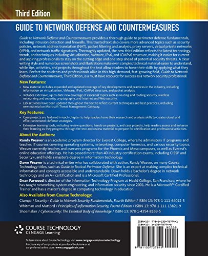 GUIDE TO NETWORK DEFENSE AND COUNTERMEASURES provides a thorough guide to perimeter defense fundamentals, including intrusion detection and firewalls. This trusted text also covers more advanced topics such as security policies, network address translation (NAT), packet filtering and analysis, proxy servers, virtual private networks (VPN), and network traffic signatures. Thoroughly updated, the new third edition reflects the latest technology, trends, and techniques including virtualization, VMware, IPv6, and ICMPv6 structure, making it easier for current and aspiring professionals to stay on the cutting edge and one step ahead of potential security threats. A clear writing style and numerous screenshots and illustrations make even complex technical material easier to understand, while tips, activities, and projects throughout the text allow you to hone your skills by applying what you learn. Perfect for students and professionals alike in this high-demand, fast-growing field, GUIDE TO NETWORK DEFENSE AND COUNTERMEASURES, Third Edition, is a must-have resource for success as a network security professional.