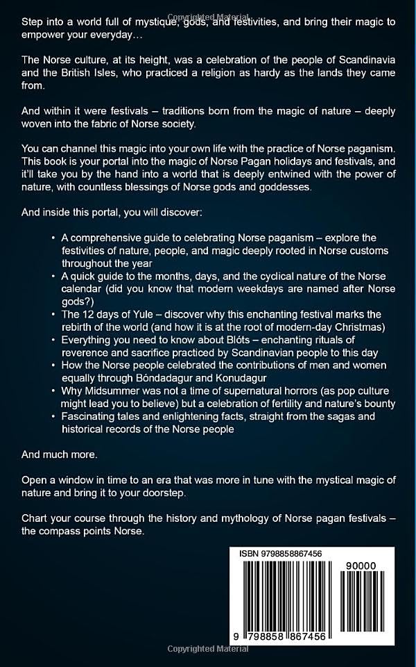 Step into a world full of mystique, gods, and festivities, and bring their magic to empower your everyday… It’s 803 A.D. You’re at the prow of a Viking longship, waiting to make landfall with your fellow Norse warriors. The cold air breaches your lungs, the jagged Fjords calm your heart, and the rolling hills ahead of you make you realize that you are home. And the first thought in your mind? The festivities that await you – a battle cry for all-father Odin, a reverence for the magic of Freya, and a celebration for the protection offered by Thor. This might seem out of touch today, but it was very much the life led by Norse people during the Viking age. The Norse culture, at its height, was a celebration of the people of Scandinavia and The British Isles, who practiced a religion as hardy as the lands they came from. And within it were festivals – traditions born from the magic of nature – deeply woven into the fabric of Norse society. Each of these sacred celebrations was a reminder of the cyclical nature of life, and of the gods and goddesses who channeled their elemental magic and bestowed blessings upon humankind. But did you know that this magic is not lost? And that you can practice Norse paganism to channel this magic into your own life? How, you ask? This book is your portal into the magic of Norse Pagan holidays and festivals, and it’ll take you by the hand into a world that is deeply entwined with the power of nature, with countless blessings of Norse gods and goddesses. And inside this portal, you will discover: A comprehensive guide to celebrating Norse paganism – explore the festivities of nature, people, and magic deeply rooted in Norse customs throughout the year A quick guide to the months, days, and the cyclical nature of the Norse calendar (did you know that modern weekdays are named after Norse gods?) The 12 days of Yule – discover why this enchanting festival marks the rebirth of the world (and how it is at the root of modern-day Christmas) Everything you need to know about Blots – enchanting rituals of reverence and sacrifice practiced by Scandinavian people to this day How the Norse people celebrated the contributions of men and women equally through Bondadagur and Konudagur Why Midsummer was not a time of supernatural horrors (as pop culture might lead you to believe) but a celebration of fertility and nature’s bounty Fascinating tales and enlightening facts, straight from the sagas and historical records of the Norse people And much more. While your modern life might stand in stark contrast with many of these practices, you will find that this book is not about forcing you to abandon your creature comforts. It’s about opening a window in time to an era that was more in tune with the mystical magic of nature and bringing it to your doorstep. Chart your course through the history and mythology of Norse pagan festivals – the compass points Norse. Scroll up and click “Add to Cart” right now.