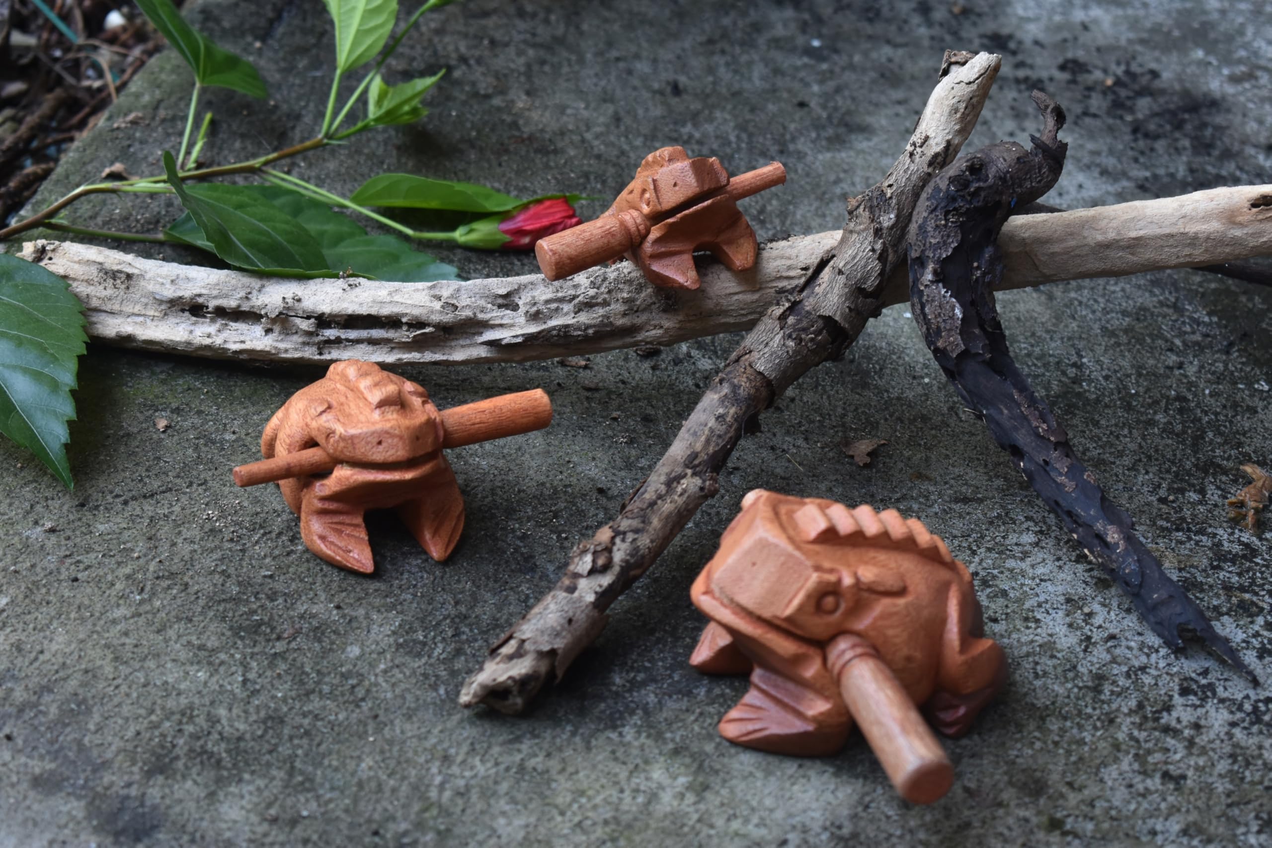 - Size and material: 5 cm./ 2″, 8 cm./ 3″, 10 cm. / 3.5″ (measured from the mouth to the tip of the hind leg) This musical instrument is a natural wood product by drilling a hollow in the middle to make its sound. You will enjoy its fresh chime.