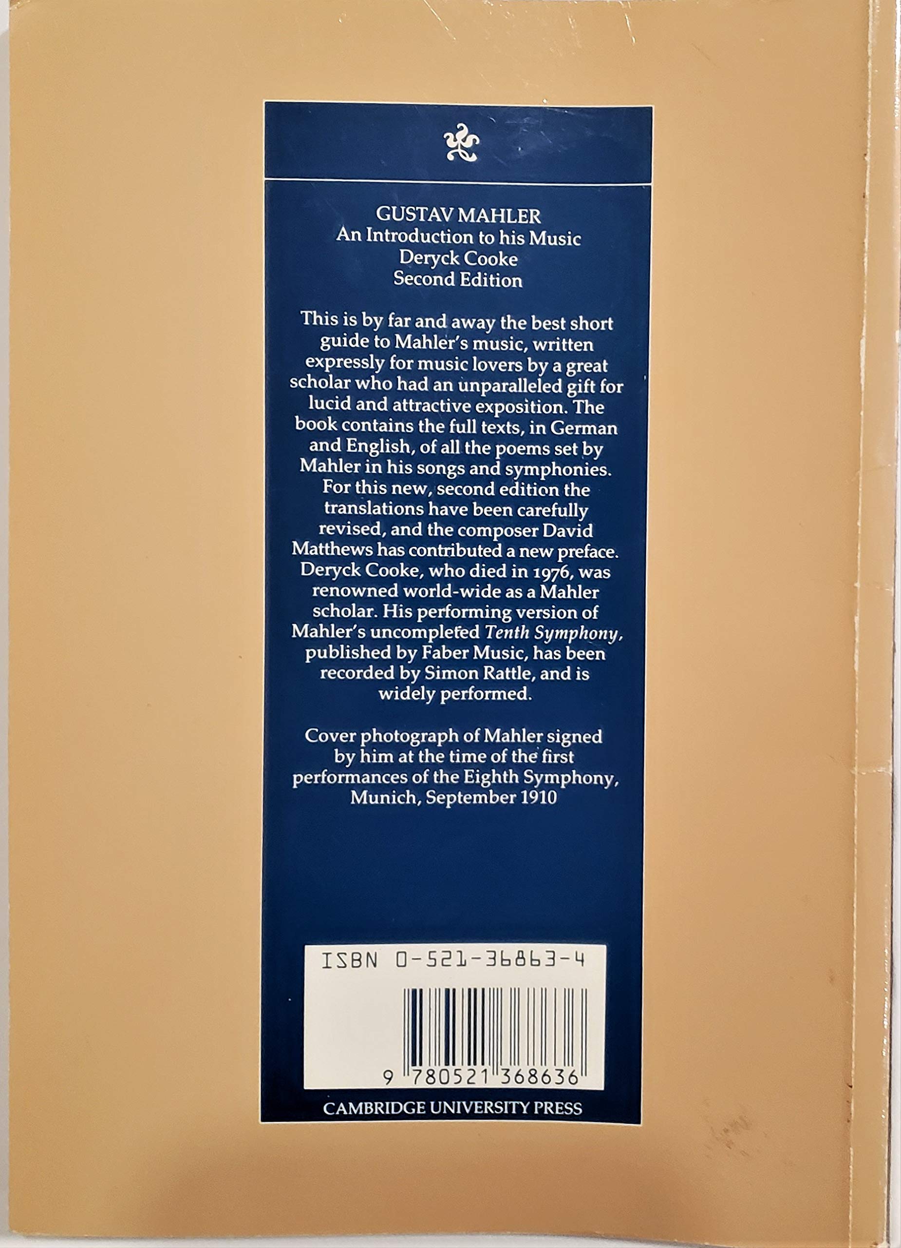 From the rear cover of this 127 page book: “This is by far and away the best short guide to Mahler’s music, written expressly for music lovers by a great scholar who had an unparalleled gift for lucid and attractive exposition. The book contains full texts, in German and English, of all the poems set by Mahler in his songs and symphonies. For this new, second edition the translations have been carefully revised, and the composer David Matthews has contributed a new preface. Deryck Cooke, who died in 1976, was renowned world-wide as a Mahler scholar. His performing version of Mahler’s uncompleted ‘Tenth Symphony’ published by Faber Music, has been recorded by Simon Rattle, and is widely performed.”