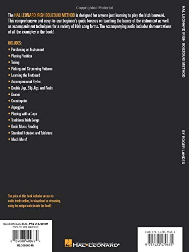 (Instructional). The Hal Leonard Irish Bouzouki Method is designed for anyone just learning to play the Irish bouzouki. This comprehensive and easy-to-use beginner’s guide focuses on teaching the basics of the instrument as well as accompaniment techniques for a variety of Irish song forms. The accompanying audio includes demonstrations of all the examples in the book and can be accessed online via streaming or download. Includes: purchasing an instrument; playing position; tuning; picking and strumming patterns; learning the fretboard; accompaniment styles; double jigs, slip jigs, and reels; drones; counterpoint; arpeggios; playing with a capo; traditional Irish songs; basic music reading; standard notation and tablature. Online audio is accessed at halleonard.com/mylibrary