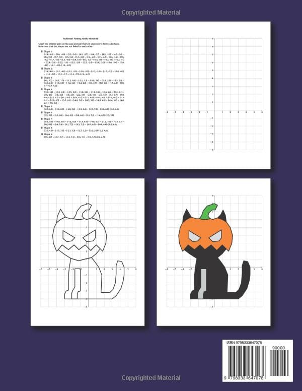 Unveil Spooky Secrets with This Fun-tastic Halloween Math Adventure! Calling all math detectives, grades 4-7 (ages 9-12)! This thrilling Halloween workbook is packed with spooky mysteries waiting to be solved through the power of math! Inside, you’ll find: Plotting Points: Master the art of using coordinates to create spooky shapes. (coordinate graphing workbook, cartesian plane activities) Connect the Dots: Reveal hidden Halloween creatures by connecting numbered dots. (plotting points activities, coordinate graphing worksheets) Draw Hidden Pictures: Follow the spooky clues to uncover mysterious Halloween scenes. (hidden picture math, coordinate graphing puzzles) Coloring Pictures: Bring your Halloween creations to life with vibrant colors! (math coloring pages, coordinate graphing activities) This ghoulishly good workbook helps kids: Develop essential coordinate graphing skills. (coordinate graphing for kids, coordinate plane worksheets) Sharpen critical thinking and problem-solving abilities. (math problem solving activities, math puzzles for kids) Boost creativity and imagination. (math coloring activities, hidden picture puzzles) Turn math practice into a fang-tastic Halloween adventure! (halloween math activities, fun math worksheets) Get ready for a frightfully fun learning experience! Order your copy today!