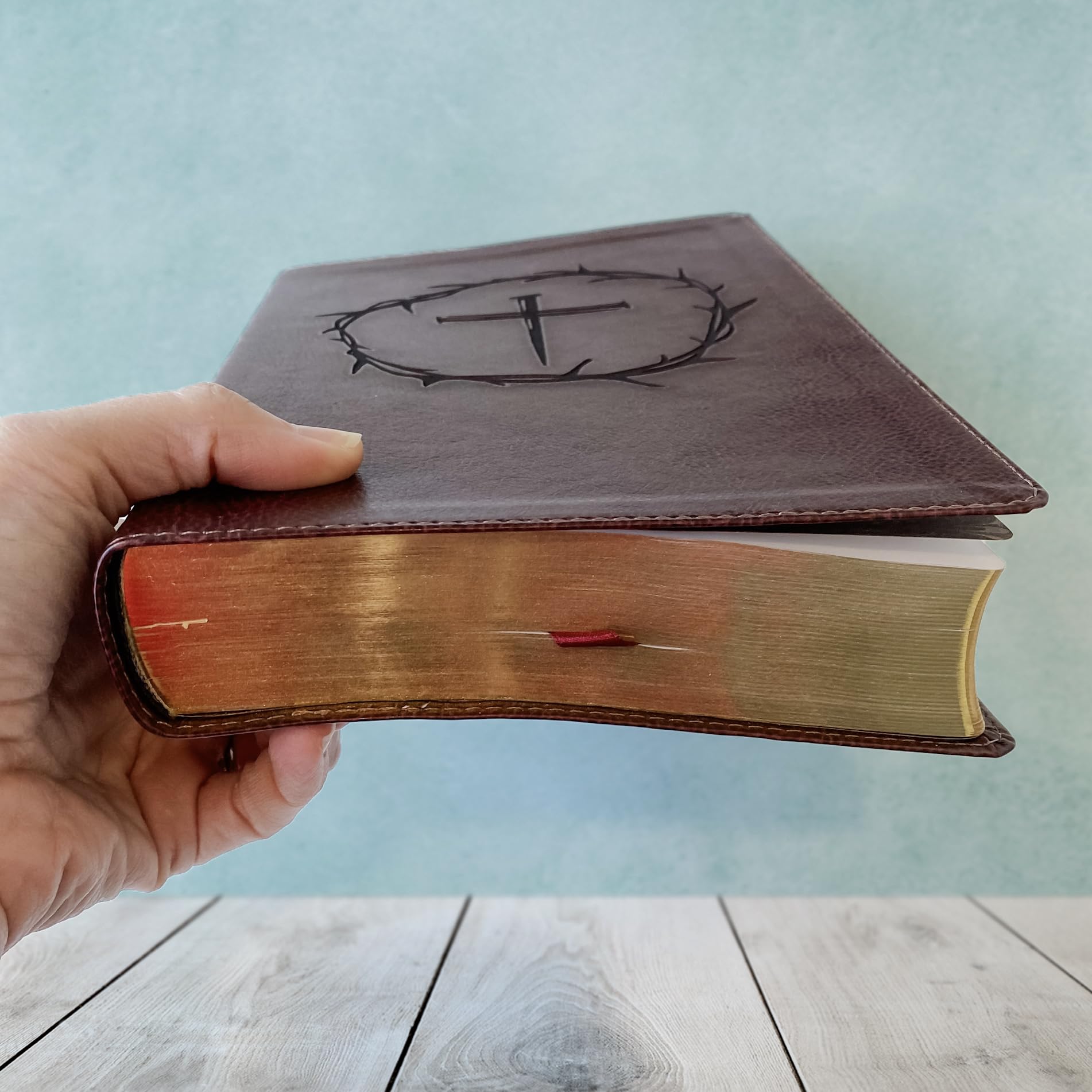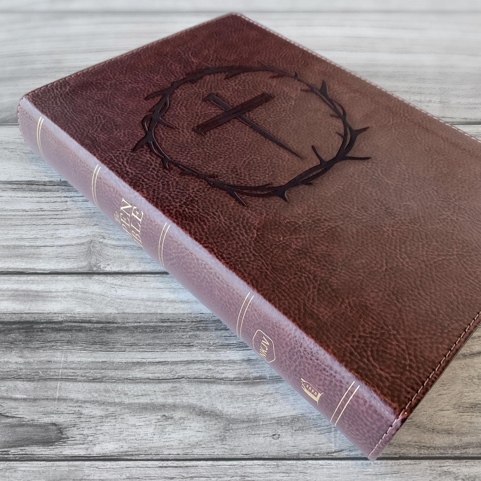 - BIBLE DETAILS – NKJV Wide Margin Bible | Brown faux leather | New King James Version | Length – 9.25″ | Width – 6.25″ | Thickness – 1.5″ | Font – 8.5 pt.