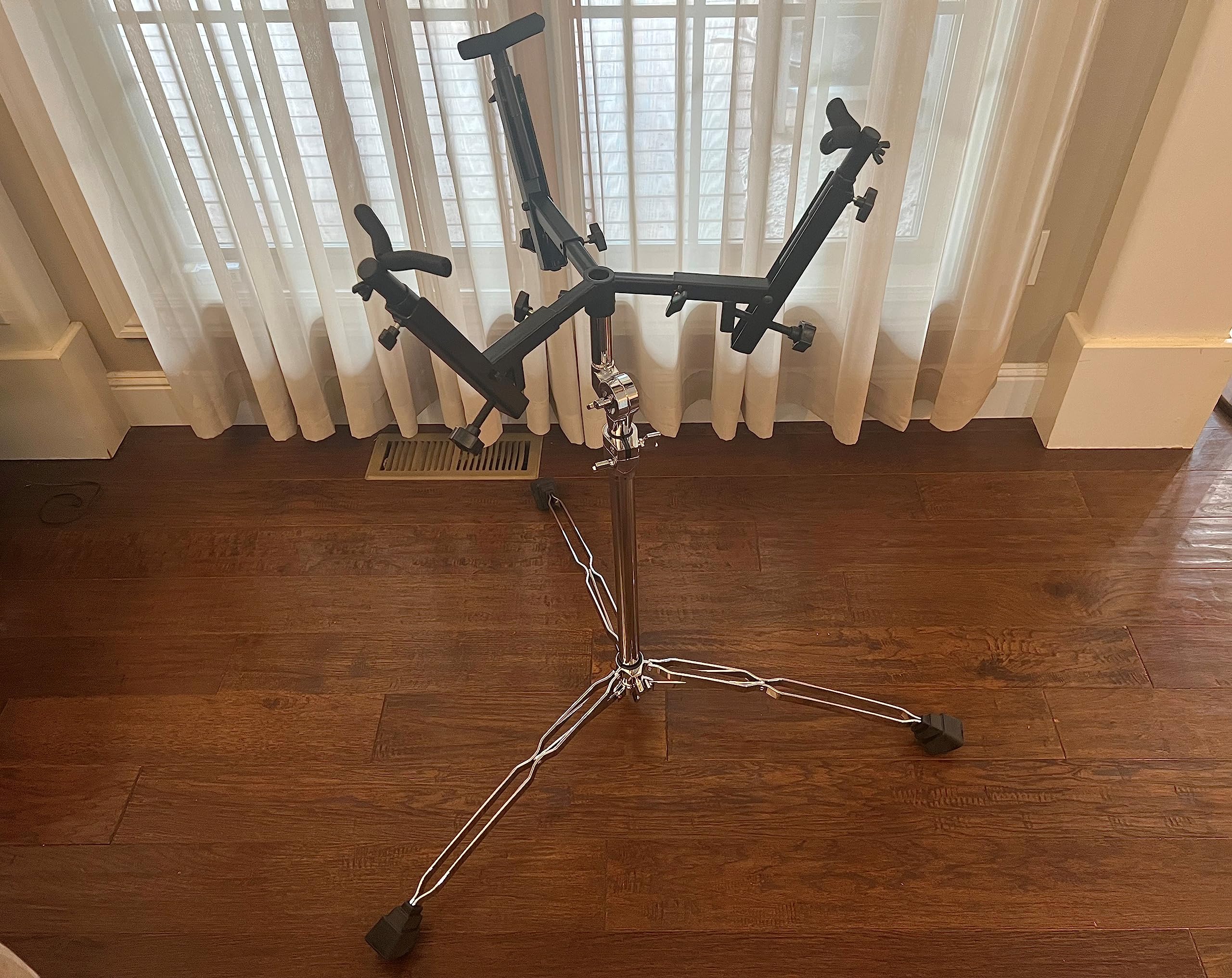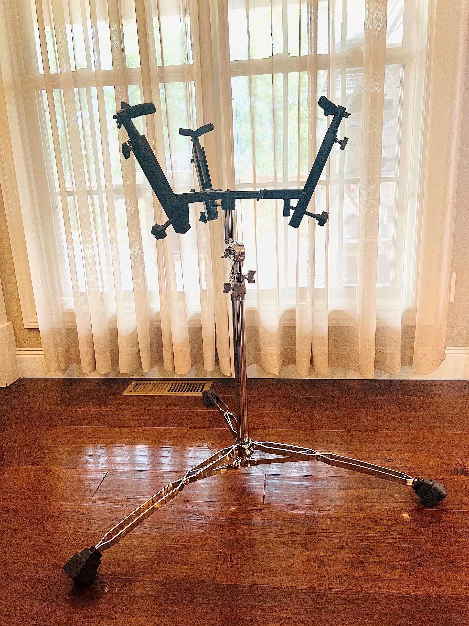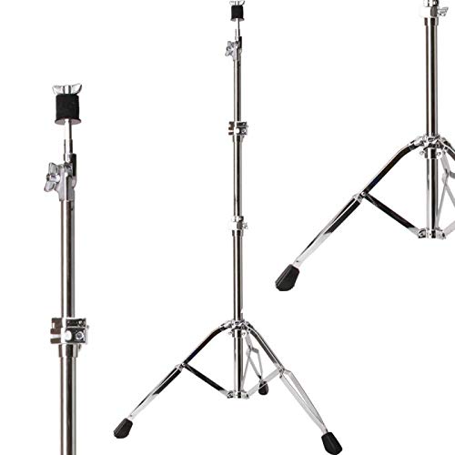 Heavy duty, Fits all diameter of hand pan, Chrome plated steel ,rubber padded, double braced tripod legs fully height/ angle adjustable Folds for easy transport and storage, Diameter can get 24″, it can get 40 inches at lowest and 65 inches at highest, Adjust center rod height as needed by loosening the screws on the rod and extending or shortening