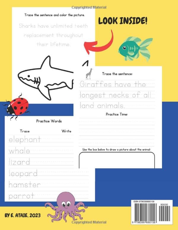 Handwriting Practice Fun Animal Facts Workbook Attention parents! Are you looking for a fun and educational way to help your child improve their handwriting skills? Look no further than our latest handwriting workbook for kids ages 7-9. Not only will your child get lots of practice tracing sentences with fun animal facts, but variety of activities are included. Tracing animal facts sentences then practice writing the sentence. Draw a picture of what you read. Vocabulary and sight words tracing and writing practice. Fun coloring pages with tracing sentences about animal facts. Your child will be engaged and entertained while improving their handwriting and learning about the animal kingdom.