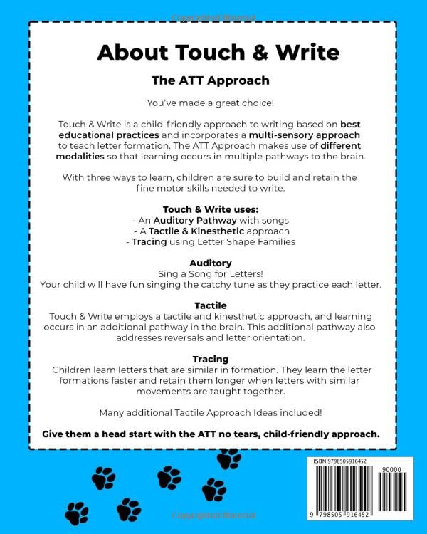 Learn to Write & Handwriting Practice with the AUDITORY, TACTILE & TRACING APPROACH! 130 Pages of Activities! Touch & Write is a child-friendly approach to writing and incorporates a multi-sensory approach to teach letter formation. The ATT Approach makes use of different modalities so that learning occurs in multiple pathways to the brain. With three ways to learn, children are sure to build and retain the fine motor skills needed for writing. Touch & Write uses: AUDITORY PATHWAY: Sing a Song for Letters! Children will have fun singing the catchy tune as they practice each letter. A TACTILE & KINESTHETIC Approach:Learning occurs in an additional pathway in the brain, and children learn and retain the movements needed to form the letters. This additional pathway also addresses reversals, letter orientation and can help with dyslexia. TRACING using LETTER SHAPE FAMILIES:They learn letters faster and retain them longer when letters with similar movements are taught together. Many additional Tactile Approach Ideas included! Give them a head start with the ATT no tears, child-friendly approach.