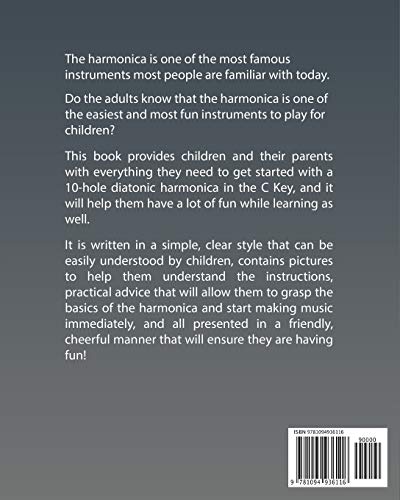 Are you looking for a book for children that teach you in a fun way how to play the harmonica and at the same time that it is a songbook with the best songs for children to practice? It is written in a simple, clear style that can be easily understood by children, contains pictures to help them understand the instructions, practical advice that will allow them to grasp the basics of the harmonica and start making music immediately, and all presented in a friendly, cheerful manner that will ensure they are having fun! With “Harmonica for Kids”, you’ll get: Descriptions of how harmonicas work that doesn’t go into too much detail but give the basics to kids Several tablature notations of simple songs kids love that will get them playing and having fun as soon as possible More detailed descriptions of how harmonica holes operate and how to blow and draw on them Clearly explained step-by-step instructions for a wide variety of exercises that will improve the child’s physical health and make it easier for them to play wonderfully The harmonica is one of the most famous instruments most people are familiar with today. Do you know that the harmonica is one of the easiest and most fun instruments to play for children? This book provides children and their parents with everything they need to get started with a 10-hole diatonic harmonica in the C Key, and it will help them have a lot of fun while learning as well. Don’t wait another minute. Grab your copy now!