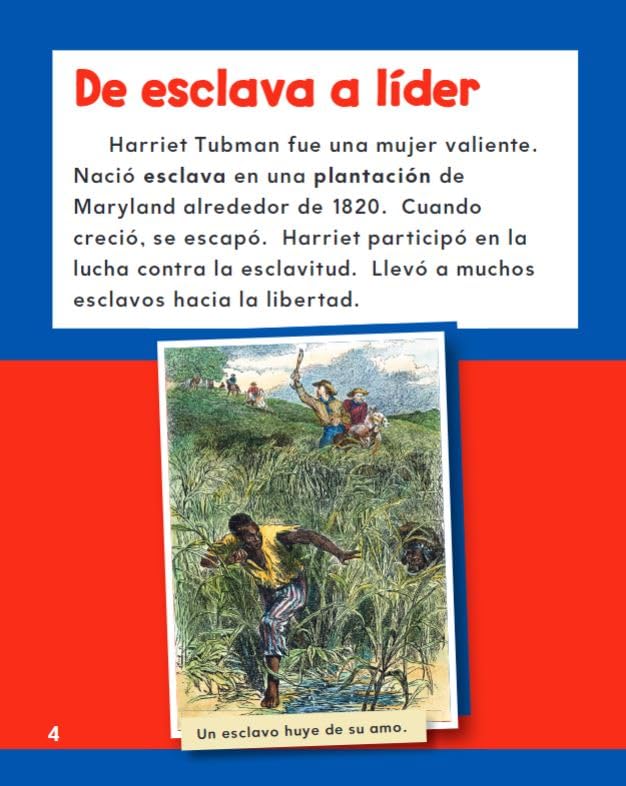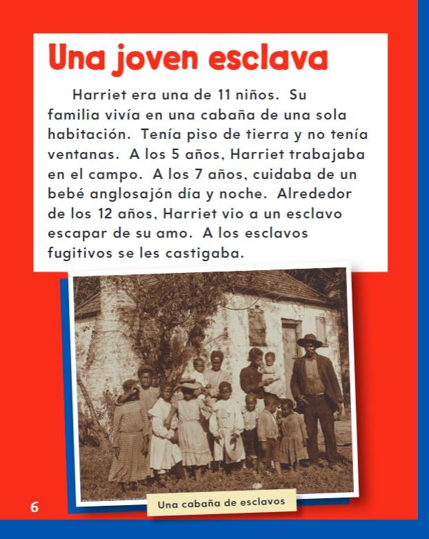 This book teaches students about the life of Harriet Tubman and her role in the Underground Railroad, available in Spanish.