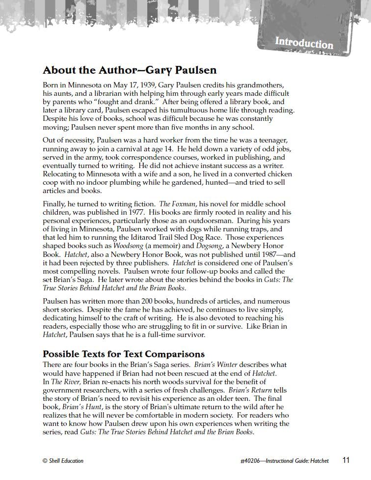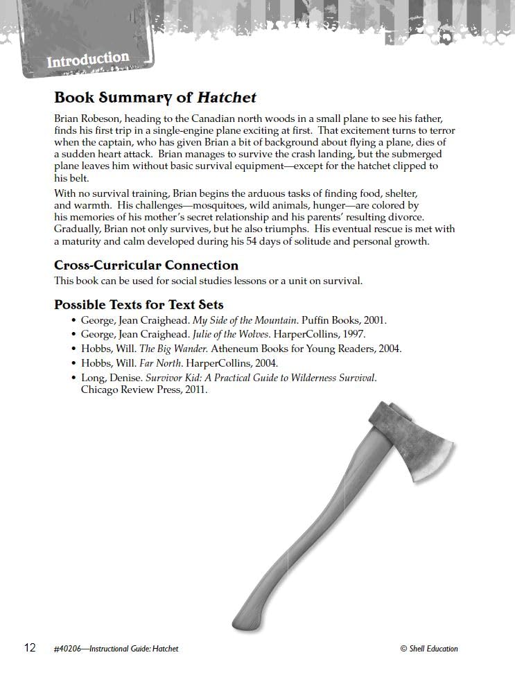 Use this guide to explore this Newbery Honor Book about a boy who must learn to survive in the wilderness with only the help of his hatchet. Hatchet: An Instructional Guide for Literature is filled with challenging cross-curricular activities and lessons that work in conjunction with the text. Students will learn how to analyze story elements in multiple ways, practice close reading, improve text-based vocabulary, and determine meaning through text-dependent questions. Strengthen your students’ literacy skills by implementing this high-interest resource in your classroom!