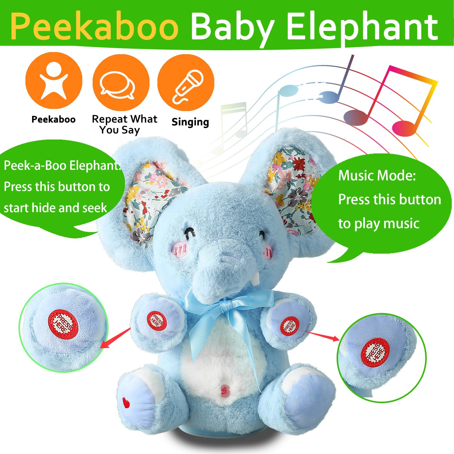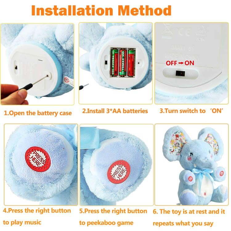 Mimicking Repeat What You Say: When Peek A Boo Baby Elephant is still, it will imitate and repeat what you say, and feel the sounds from the outside world. Can entertain and interact with your kids for hours of fun.
