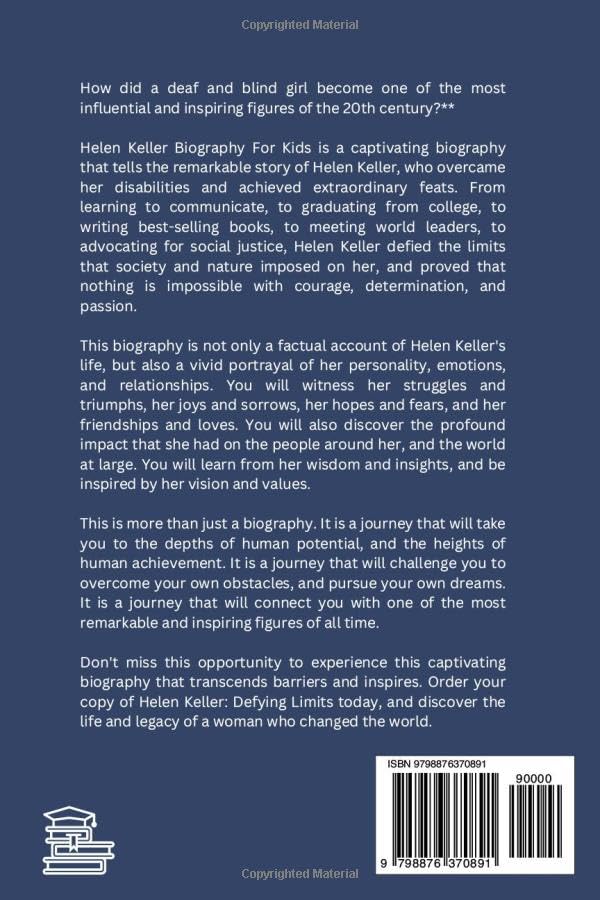 How did a deaf and blind girl become one of the most influential and inspiring figures of the 20th century? Helen Keller Biography For Kids is a captivating biography that tells the remarkable story of Helen Keller, who overcame her disabilities and achieved extraordinary feats. From learning to communicate, to graduating from college, to writing best-selling books, to meeting world leaders, to advocating for social justice, Helen Keller defied the limits that society and nature imposed on her, and proved that nothing is impossible with courage, determination, and passion. This biography is not only a factual account of Helen Keller’s life, but also a vivid portrayal of her personality, emotions, and relationships. You will witness her struggles and triumphs, her joys and sorrows, her hopes and fears, and her friendships and loves. You will also discover the profound impact that she had on the people around her, and the world at large. You will learn from her wisdom and insights, and be inspired by her vision and values. This is more than just a biography. It is a journey that will take you to the depths of human potential, and the heights of human achievement. It is a journey that will challenge you to overcome your own obstacles, and pursue your own dreams. It is a journey that will connect you with one of the most remarkable and inspiring figures of all time. Don’t miss this opportunity to experience this captivating biography that transcends barriers and inspires. Order your copy of Helen Keller Biography For Kids today, and discover the life and legacy of a woman who changed the world.