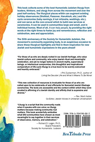 This book collects some of the best Humanistic Judaism liturgy from leaders, thinkers, and clergy from across the movement and over the past half-century. The liturgical pieces within can augment existing holiday observances (Shabbat, Passover, Hanukkah, etc.) and life-cycle ceremonies (baby namings, b’nai mitzvahs, weddings, etc.), and can serve as the core around which to build new services or ceremonies. It can be used in communities large and small, and in individual homes. Most of all, it can help people, by providing the right words at the right times to foster joy and remembrance, reflection and celebration, awe and appreciation. The 50th anniversary of the Society for Humanistic Judaism, the movement’s community-organizing body, is an auspicious occasion to share these liturgical highlights and find in them inspiration for new Jewish and humanistic expressions in the years ahead!