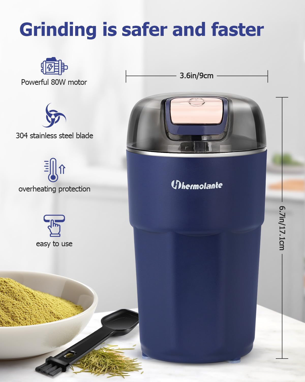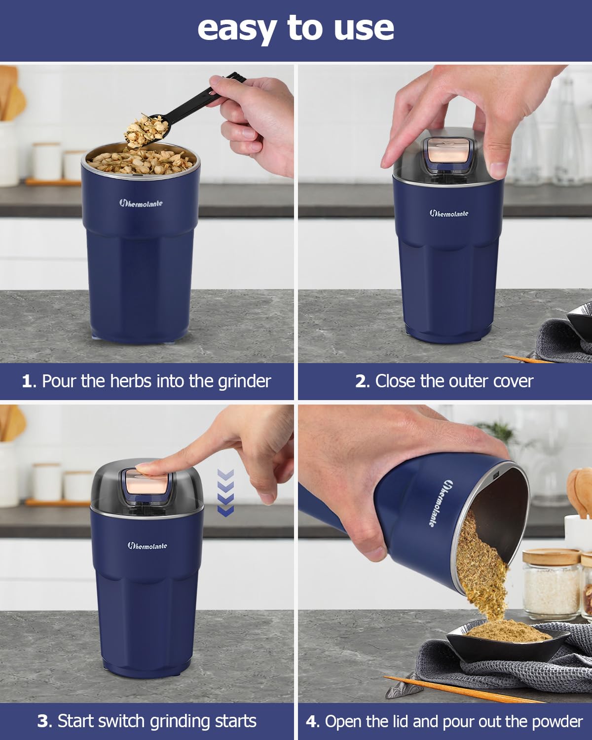 - Easy to Grind: Spice grinder with powerful motor,uniform and fast grinding;Electric spice grinder quickly grinds up to 80 grams of herbs, spices or coffee beans in a short period of time,Even and fast grinding can effectively maintain the original flavor of the herb spices.