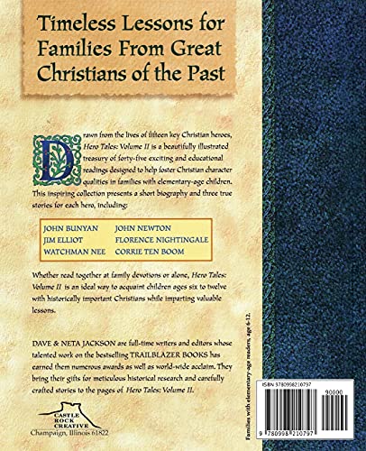 Timeless Lessons for families from great Christians of the past.Drawn from the lives of fifteen key Christian heroes, Hero Tales, Vol. II is a beautifully illustrated treasury of forty-five exciting and educational readings designed to help foster Christian character qualities in families with elementary-age children. This inspiring collection presents a short biography and three true stories for each hero, including:John Bunyan, John Newton, Jim Elliot, Florence Nightingale, Watchman Nee, and Corrie ten Boom.Whether read together at family devotions or alone, Hero Tales, Vol II is an ideal way to acquaint children six to twelve with historically important Christians while imparting valuable lessons.This is volume II in a series of four Hero Tales originally published by Bethany House Publishers and is now republished by Castle Rock Creative.
