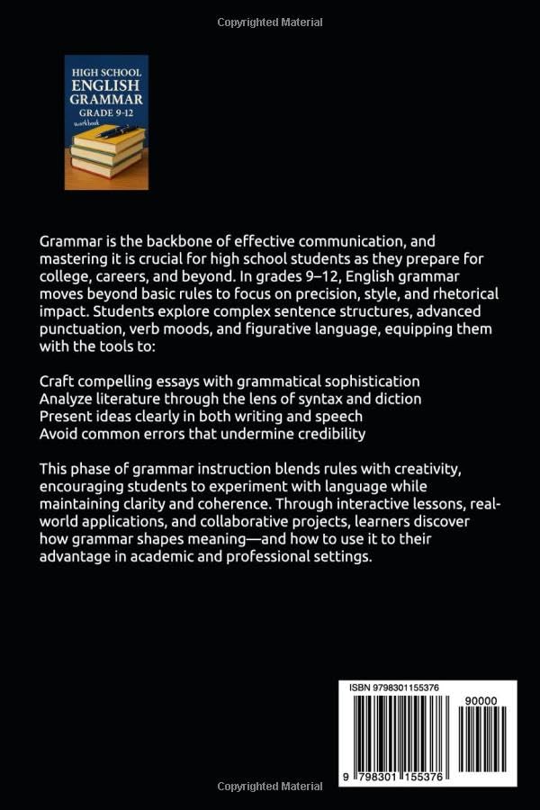 High school English grammar focuses on developing advanced skills in writing, speaking, and analyzing language. Key areas include: Sentence Structure: Understanding simple, compound, complex, and compound-complex sentences to create variety and clarity in writing. Parts of Speech: Advanced usage of nouns, verbs, adjectives, adverbs, conjunctions, prepositions, and interjections to build more nuanced sentences. Punctuation and Mechanics: Mastery of commas, semicolons, colons, quotation marks, and proper formatting to enhance readability and precision. Tenses and Verb Usage: Using consistent and accurate verb tenses to express time relationships effectively. Clauses and Phrases: Differentiating between dependent/independent clauses and various phrase types for sentence cohesion. Vocabulary Development: Building academic, domain-specific, and literary vocabulary for versatile communication. Advanced Topics: Exploring passive/active voice, parallelism, modifiers, and rhetorical devices for polished and impactful writing. Editing and Revising: Applying grammar rules to refine essays, creative works, and professional writing projects. By mastering these areas, students gain the tools to communicate confidently and effectively, preparing them for academic success and professional endeavors.