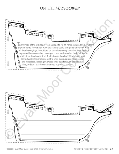 In History Pockets–Colonial America, Grades 4–6, you’ll find eight memorable discovery pockets. The introduction pocket gives an overview of the settlement of the thirteen original colonies. The other pockets feature a look at the aspects of colonial life in the northern, middle, and southern colonies. The book contains the following pockets: Introduction to Colonial America–maps and a time line, The First Settlements–Lost Colony, Jamestown, and Plymouth, The Native Americans–storytelling, rich languages, and peace treaty, Homes and Villages–wood-plank homes, log cabins, and plantations, Daily Life–food, clothing, and games, School–penmanship, hornbooks, and daily schedule, Work–trades, apprenticeship, and slavery, Memorable People–John Smith, Pocahontas, Squanto, and more. In each of the pockets you will find: a reproducible pocket label, a bookmark of short, fun facts about the subject, a fact sheet of background information for teacher and students, arts and crafts projects, plus writing activities. Evaluation forms are provided at the end of the book for teacher and student assessment purposes.