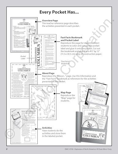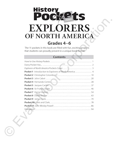 History Pockets-Explorers of North America, Grades 4-6+, contains eleven discovery pockets. The introduction pocket gives an overview of exploration throughout North America. The other pockets feature ten famous explorers and their journeys. Each of the pockets contains: a reproducible pocket label a bookmark of short fun facts about the subject a reference map of the voyage(s) made by the explorer a fact sheet of background information for teacher and students arts and crafts projects writing activities Evaluation forms are provided at the end of the book for teacher and student assessment purposes The book includes the following pockets: Introduction to Explorers of North America Christopher Columbus John Cabot Hernando Cortes Jacques Cartier Sir Francis Drake Henry Hudson Daniel Boone James Cook Lewis and Clark John Wesley Powell This resource contains teacher support pages, reproducible student pages, and an answer key.