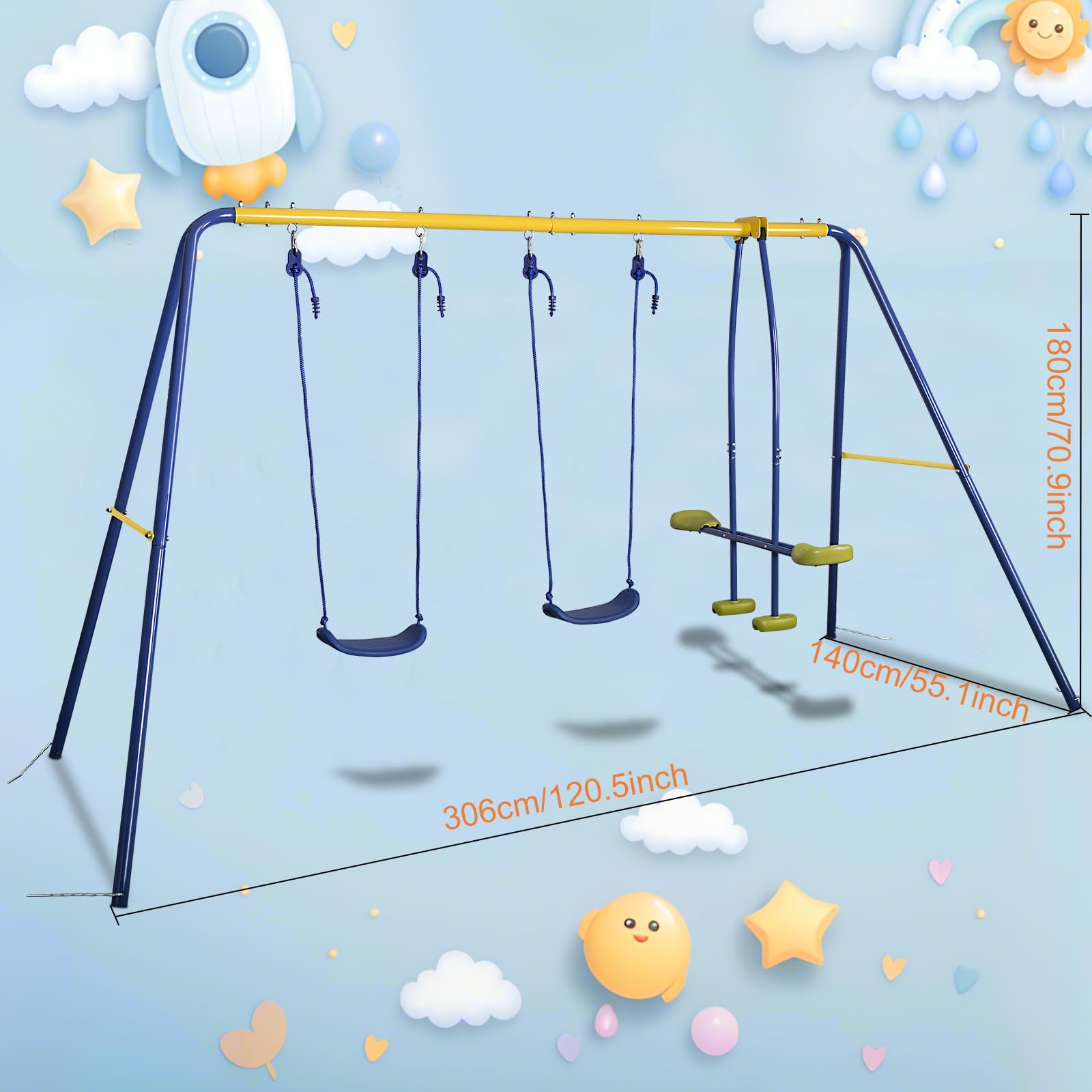 [(Easy to Assemble)] Easy to set up with the included hardware and accessories. Weight capacity of this swing set is 440lbs. You can also take the seat off and replace different item if the seat is fitted.