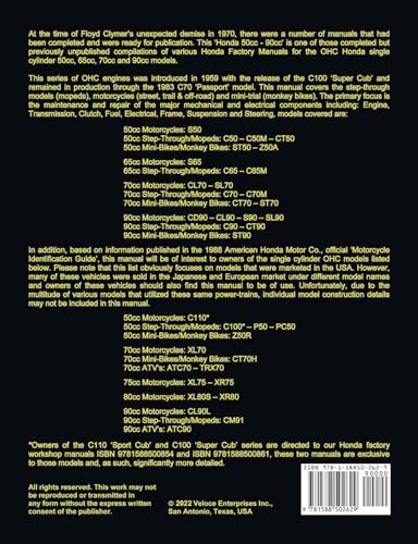 142 pages, with more than 250 illustrations, size 8.25 x 10.75 inches. At the time of Floyd Clymer’s unexpected demise in 1970, there were a number of manuals that had been completed and were ready for publication. This ‘Honda 50cc – 90cc’ is one of those completed but previously unpublished compilations of various Honda Factory Manuals for the OHC Honda single cylinder 50cc, 65cc, 70cc and 90cc models. This series of OHC engines was introduced in 1959 with the release of the C100 ‘Super Cub’ and remained in production through the 1983 C70 ‘Passport’ model. This manual covers the step-through models(mopeds), motorcycles(street, trail & off-road) and mini-trial(monkey bikes). The primary focus is the maintenance and repair of the major mechanical and electrical components including: Engine, Transmission, Clutch, Fuel, Electrical, Frame, Suspension and Steering, models covered are: 50cc Motorcycles: S50 50cc Step-Through/Mopeds: C50-C50M-CT50 50cc Mini-Bikes/Monkey Bikes: ST50-Z50A 65cc Motorcycles: S65 65cc Step-Through/Mopeds: C65-C65M 70cc Motorcycles: CL70-SL70 70cc Step-Through/Mopeds: C70-C70M 70cc Mini-Bikes/Monkey Bikes: CT70-ST70 90cc Motorcycles: CD90-CL90-S90-SL90 90cc Step-Through/Mopeds: C90-CT90 90cc Mini-Bikes/Monkey Bikes: ST90 In addition, based on information published in the 1988 American Honda Motor Co., official ‘Motorcycle Identification Guide’, this manual will be of interest to owners of the single cylinder OHC models listed below. Please note that this list obviously focuses on models that were marketed in the USA. However, many of these vehicles were sold in the Japanese and European market under different model names and owners of these vehicles should also find this manual to be of use. Unfortunately, due to the multitude of various models that utilized these same power-trains, individual model construction details may not be included in this manual. 50cc Motorcycles: C110* 50cc Step-Through/Mopeds: C100*-P50-PC50 50cc Mini-Bikes/Monkey Bikes: Z50R 70cc Motorcycles: XL70 70cc Mini-Bikes/Monkey Bikes: CT70H 70cc ATV’s: ATC70-TRX70 75cc Motorcycles: XL75-XR75 80cc Motorcycles: XL80S-XR80 90cc Motorcycles: CL90L 90cc Step Through/Mopeds: CM91 90cc ATV’s: ATC90 *Owners of the C110 ‘Sport Cub’ & C100 ‘Super Cub’ series are directed to our Honda factory workshop manuals ISBN 9781588500854 & ISBN 9781588500861, these two manuals are exclusive to those models and as such, significantly more detailed. After his visit to Japan in 1961, Floyd Clymer published ‘The Complete Catalog of Japanese Motor Vehicles’ (ISBN 9781588502209). Based on his experiences during that visit, Floyd also anticipated the need for repair manuals for those Japanese motorcycles that were just starting to be imported into the USA [Yamaha (1958), Honda (1959), Suzuki (1963)]. The predominance of the Floyd Clymer Japanese motorcycle manuals were reprints or compilations of the factory publications, which today makes them more desirable than the current aftermarket manuals.