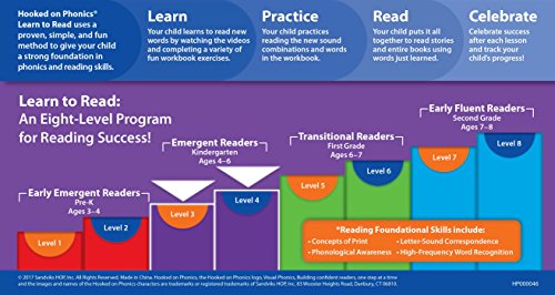 Hooked on Phonics(r) Learn to Read Levels 3&4 Complete includes both Kindergarten levels of the complete 8-level Learn to Read series. – Level 1: Early Emergent Readers (Pre-K) – Level 2: Early Emergent Readers (Pre-K) – Level 3: Emergent Readers (Kindergarten) – Level 4: Emergent Readers (Kindergarten) – Level 5: Transitional Readers (First Grade) – Level 6: Transitional Readers (First Grade) – Level 7: Early Fluent Readers (Second Grade) – Level 8: Early Fluent Readers (Second Grade) All 8 levels are available in the Hooked on Phonics Learn to Read Kit Designed to help your child learn the building blocks of reading, Learn to Read Levels 3&4 covers: – A Review of Letter Names and Letter Sounds – Short “a” and “i” Vowel Sounds – Adding “-s” to Nouns and Verbs – Short “o,” “u,” and “e” Vowel Sounds – The “-ck” Ending Sound – Compound Words – 34 New Sight Words This set includes: – 12 Original Storybooks written to reinforce the skills your child learns in the program – Cat – Tag – Pig – The Kit – In the Bin – The Rats – Pop Fox – The Fog – Fun in the Sun – Dog Bug – Ted – Pig’s Backpack – 2 Bonus Books by the award-winning children’s book authors and illustrators David Ezra Stein and Rosemary Wells – Tim and Sam by David Ezra Stein – Big Bad Ben by Rosemary Wells – 2 Workbooks that will guide you and your child through all of the lessons and many fun activities – 2 DVDs filled with music videos and fun introductions to each lesson, where letters come to life – 2 Sets of Stickers to proudly display in the workbooks and celebrate reading success – Video streaming online of all DVD content and additional bonus content on MyHOP (My.HookedonPhonics.com) Designed in conjunction with leading educators, award-winning authors, teachers and parents, Hooked on Phonics(r) Learn to Read uses a proven, simple, and fun method to give your child a strong foundation in phonics and reading skills. – Learn: Your child learns to read new words by watching the videos and reading the workbook. – Practice: Your child practices reading the new sound combinations and words in the workbook. – Read: Your child puts it all together to read a great story. – Celebrate: Celebrate success after each lesson and track your child’s progress!