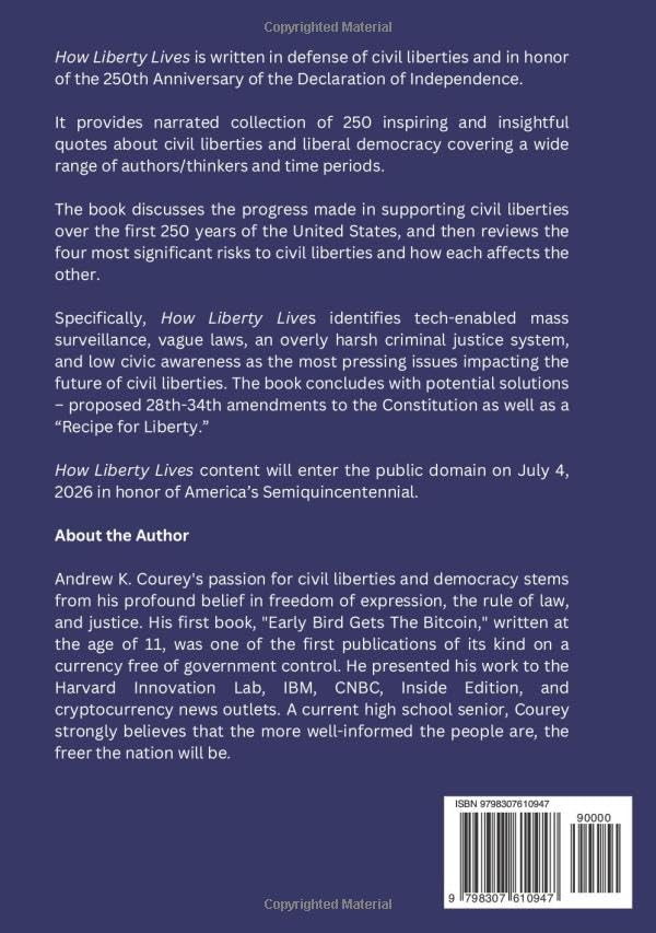How Liberty Lives is written in defense of civil liberties and in honor of the 250th Anniversary of the Declaration of Independence. It provides narrated collection of 250 inspiring and insightful quotes about civil liberties and liberal democracy covering a wide range of authors/thinkers and time periods. The book discusses the progress made in supporting civil liberties over the first 250 years of the United States, and then reviews the four most significant risks to civil liberties and how each affects the other. Specifically, How Liberty Lives identifies tech-enabled mass surveillance, vague laws, an overly harsh criminal justice system, and low civic awareness as the most pressing issues impacting the future of civil liberties. The book concludes with potential solutions – proposed 28th-34th amendments to the Constitution as well as a “Recipe for Liberty.” How Liberty Lives content will enter the public domain on July 4, 2026 in honor of America’s Semiquincentennial. About the Author Andrew K. Courey’s passion for civil liberties and democracy stems from his profound belief in freedom of expression, the rule of law, and justice. His first book, “Early Bird Gets The Bitcoin,” written at the age of 11, was one of the first publications of its kind on a currency free of government control. He presented his work to the Harvard Innovation Lab, IBM, CNBC, Inside Edition, and cryptocurrency news outlets. A current high school senior, Courey strongly believes that the more well-informed the people are, the freer the nation will be.