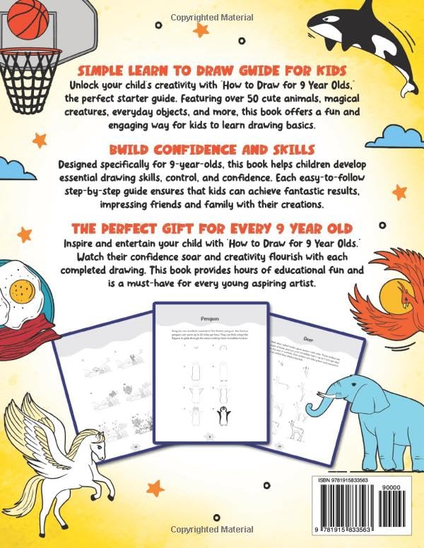 Start Your Kid’s Art Journey – The Perfect Gift for 9-Year-Old Artists! Unlock your child’s creativity with “How to Draw for 9 Year Olds.” Part of the How to Draw Series, this book features 50+ fun illustrations, including cute animals, magical sea creatures, monsters, everyday objects, and more. It’s a fun way for kids to learn drawing basics, improve their art skills, and get better at coloring. Made for 9-Year-Olds: Perfectly designed illustrations for a 9-Year-Old’s age and skill level. Easy Step-by-Step Instructions: Simple, easy-to-follow steps that make drawing easy and fun. 50+ Fun Drawings for Boys and Girls: From spaceships to cute sausage dogs, unicorns, dragons, and more! Practice Space: Special areas for kids to practice and try out new ideas. Color Your Creations: After drawing, kids can add color and bring their art to life. Build Confidence and Skills: Helps 9-year-olds grow their drawing skills and feel proud of their work. The Perfect Gift for Every 9-Year-Old Watch your child’s confidence grow and creativity shine with each drawing they complete. This book offers hours of fun and is a must-have for every young artist. Click “Add to Cart” and start your child’s artistic journey today!