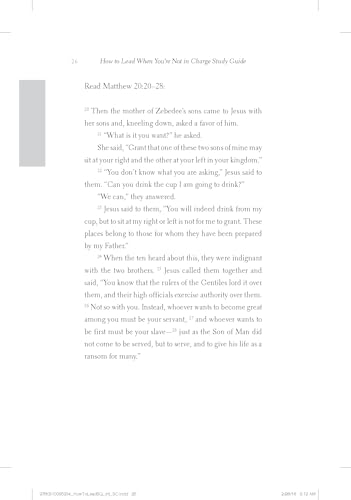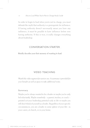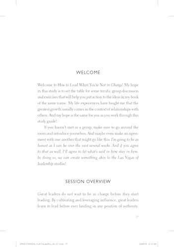 The greatest myth of leadership is that you must be in charge in order to lead. Great leaders aren’t paralyzed by not being in a position of recognized authority. Great leaders lead with or without that authority and learn to unleash their positive influence wherever they are. In this six-session, video-based study (DVD/streaming video sold separately), dynamic author and pastor Clay Scroggins shares his first-hand experience working under Andy Stanley at North Point Community Church. He explains the nature of leadership and what it takes to lead yourself and others well with or without that impressive title. In this study you will: Learn to leverage influence instead of authority Create a game plan for leading yourself well Change the energy of your team by choosing positivity Cultivate influence by thinking critically, not being critical Avoid the trap of passivity when you feel out of control Learn an effective way to challenge people in authority over you How to Lead When You’re Not in Charge Study Guide will free you to become the great leader you want to be so you can make a difference right where you are–whether it’s in your workplace, community, or church. Even when you’re not in charge. Sessions include: The Oddity of Leadership Lead Yourself Choose Positivity Think Critically Reject Passivity Challenging Up Designed for use with the How to Lead When You’re Not in Charge Video Study 9780310095934 (sold separately).