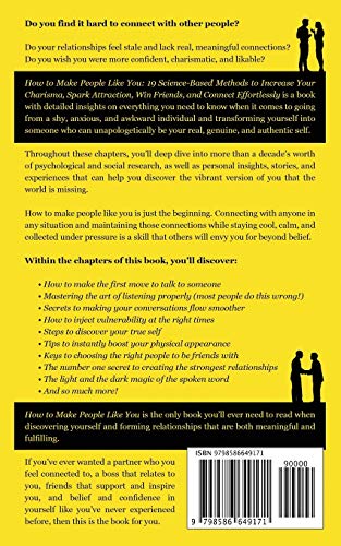 Do you find it hard to connect with other people? Do your relationships feel stale and lack real, meaningful connections? Do you wish you were more confident, charismatic, and likable? How to Make People Like You: 19 Science-Based Methods to Increase Your Charisma, Spark Attraction, Win Friends, and Connect Effortlessly is a book with detailed insights on everything you need to know when it comes to going from a shy, anxious, and awkward individual and transforming yourself into someone who can unapologetically be your real, genuine, and authentic self. Throughout these chapters, you’ll deep dive into more than a decade’s worth of psychological and social research, as well as personal insights, stories, and experiences that can help you discover the vibrant version of you that the world is missing. How to make people like you is just the beginning. Connecting with anyone in any situation and maintaining those connections while staying cool, calm, and collected under pressure is a skill that others will envy you for beyond belief. Within the chapters of this book, you’ll discover: How to make the first move to talk to someone Mastering the art of listening properly (most people do this wrong!) Secrets to making your conversations flow smoother How to inject vulnerability at the right time Steps to discover your true self Tips to instantly boost your physical appearance Keys to choosing the right people to be friends with The number one secret to creating the strongest relationships The light and the dark magic of the spoken word And so much more! How to Make People Like You is the only book you’ll ever need to read when discovering yourself and forming relationships that are both meaningful and fulfilling. If you’ve ever wanted a partner who you feel connected to, a boss that relates to you, friends that support and inspire you, and belief and confidence in yourself like you’ve never experienced before, then this is the book for you. Scroll up, click the “Buy Now” button and start learning everything you need to know when it comes to creating relationships that will stand the test of time!