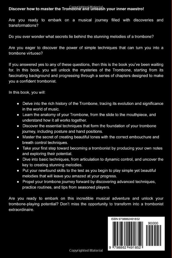 Discover how to master the Trombone and unleash your inner maestro! Are you ready to embark on a musical journey filled with discoveries and transformations? Do you ever wonder what secrets lie behind the stunning melodies of a trombone? Are you eager to discover the power of simple techniques that can turn you into a trombone virtuoso? If you answered yes to any of these questions, then this is the book you’ve been waiting for. In this book, you will unlock the mysteries of the Trombone, starting from its fascinating background and progressing through a series of chapters designed to make you a confident trombonist. In this book, you will: Delve into the rich history of the Trombone, tracing its evolution and significance in the world of music. Learn the anatomy of your Trombone, from the slide to the mouthpiece, and understand how it all works together. Discover the essential techniques that form the foundation of your trombone journey, including posture and hand positions. Master the secret of creating beautiful tones with the correct embouchure and breath control techniques. Take your first step toward becoming a trombonist by producing your own notes and exploring their potential. Dive into basic techniques, from articulation to dynamic control, and uncover the key to creating stunning melodies. Put your newfound skills to the test as you begin to play simple yet beautiful melodies that will leave you amazed at your progress. Propel your trombone journey forward by discovering advanced techniques, practice routines, and tips from seasoned players. Are you ready to embark on this incredible musical adventure and unlock your trombone-playing potential? Don’t miss the opportunity to transform into a trombonist extraordinaire. Click on the “Add to Cart” button now and get ready to experience the power and beauty of trombone mastery.