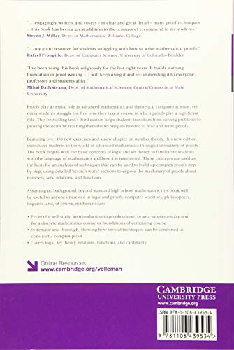 Proofs play a central role in advanced mathematics and theoretical computer science, yet many students struggle the first time they take a course in which proofs play a significant role. This bestselling text’s third edition helps students transition from solving problems to proving theorems by teaching them the techniques needed to read and write proofs. Featuring over 150 new exercises and a new chapter on number theory, this new edition introduces students to the world of advanced mathematics through the mastery of proofs. The book begins with the basic concepts of logic and set theory to familiarize students with the language of mathematics and how it is interpreted. These concepts are used as the basis for an analysis of techniques that can be used to build up complex proofs step by step, using detailed ‘scratch work’ sections to expose the machinery of proofs about numbers, sets, relations, and functions. Assuming no background beyond standard high school mathematics, this book will be useful to anyone interested in logic and proofs: computer scientists, philosophers, linguists, and, of course, mathematicians.