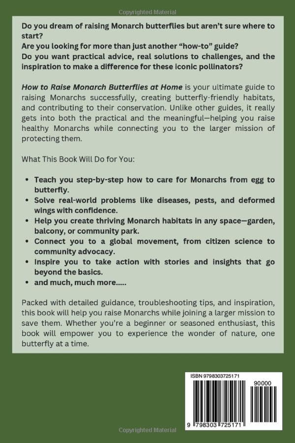 Do you dream of raising Monarch butterflies but aren’t sure where to start? Are you looking for more than just another “how-to” guide? Do you want practical advice, real solutions to challenges, and the inspiration to make a difference for these iconic pollinators? How to Raise Monarch Butterflies at Home is your ultimate guide to raising Monarchs successfully, creating butterfly-friendly habitats, and contributing to their conservation. Unlike other guides, it really gets into both the practical and the meaningful–helping you raise healthy Monarchs while connecting you to the larger mission of protecting them. What This Book Will Do for You: Teach you step-by-step how to care for Monarchs from egg to butterfly. Solve real-world problems like diseases, pests, and deformed wings with confidence. Help you create thriving Monarch habitats in any space–garden, balcony, or community park. Connect you to a global movement, from citizen science to community advocacy. Inspire you to take action with stories and insights that go beyond the basics. and much, much more….. Packed with detailed guidance, troubleshooting tips, and inspiration, this book will help you raise Monarchs while joining a larger mission to save them. Whether you’re a beginner or seasoned enthusiast, this book will empower you to experience the wonder of nature, one butterfly at a time.