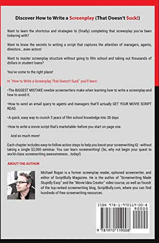 “This book is very entertaining and educational for the beginning screenwriter, as well as a gentle “nudge” to the more experienced.” –Geno Scala – Exec Dir., 74th Academy Awards Want to (finally) learn how to write a screenplay that captures the attention of managers, agents, even…dare I say…actors? Want to learn screenplay writing shortcuts and strategies to turning that idea into your head into a tangible, finished screenplay? Looking for a NO B.S. and super-simple Screenwriting 101 that will show you how to brainstorm, plot, plan, write, rewrite…and finish your way to script writing awesomeness? “Should be required reading for any aspiring screenwriter. Loved this book! I refer to it daily when tackling my own writing goals.” –Karla McNeese – Associate Producer, Dr. Jekyll and Mr. Hyde Well, in…How to Write a Screenplay That Doesn’t Suck (and Will Actually Sell) – Screenwriting Made (Stupidly) Easy Book 1 you’ll learn how to write a script that is compelling and original with such tasty screenwriting nuggets as: “Embracing Your Inner S-O-B” – How to turn your petty grudges, anxieties, obsessions, hatreds — and mild contempt for the world — into fascinating, vibrant and unforgettable characters who literally crash their way off the page and into the memory banks of your script’s readers. “What Stale Popcorn Can Teach You About Writing” – I’ll show you how to turn those trips to the over-priced movie theatre into focused, actionable intel you can use to up your film business game and become a savvy student of the screenwriting craft. “How to Stop Waiting for Perfect Story Structure (and Just Get Writing!)” – Yes, I know, you’ll get started on your screenplay ONCE you nail down the perfect structure. But in this chapter I’ll show you how four structure hacks to get you started you writing and your way to FADE OUT. “Rewriting for People Who Hate Rewriting” – When learning how to write a movie script all the books say “You gotta rewrite.” But HOW do you rewrite? What does that actually look like? In this chapter I’ll show you how the pros — and somewhat pros — do it. And unlike that generic, cliched screenwriting manual that just always seems to pop up on your radar, this tome is written by a former screenplay reader and optioned screenwriter, Michael Rogan of ScriptBully magazine, who can help you up your screenwriting IQ and avoid some of the mistakes he made. (Again and again.) So, give How to Write a Screenplay That Doesn’t Suck (and Will Actually Sell) – Screenplay Writing Made (Stupidly) Easy Book 1 a try… It may not (instantly) help you buy that house in the Hollywood Hills. But it will put you that much closer to doing that most wonderful and rare thing: a screenwriter who actually finishes what they start. Don’t believe us? Check out what the people say: Amazon categories: Reference Movies & Video Screenwriting Film Performing Arts Television Video Education & Teaching Humor & Entertainment Authorship Authors Writing, Research & Publishing Guides Direction & Production