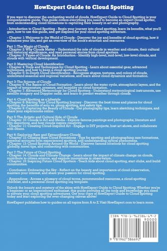 If you want to discover the enchanting world of clouds, HowExpert Guide to Cloud Spotting is your comprehensive guide. This guide covers everything you need to become an expert cloud spotter, from understanding cloud formations to capturing their beauty in art and photography. Introduction to Cloud Spotting – Begin your journey into cloud spotting, learn its benefits, what you’ll gain, how to use this guide, and get inspired for your cloud spotting adventure. Chapter 1: Welcome to the World of Clouds – Discover the joy and benefits of cloud spotting, how it enhances your life, and get an overview of the book’s structure and resources. Part 1: The Magic of Clouds Chapter 2: Why Clouds Matter – Understand the role of clouds in weather and climate, their cultural and historical significance, and read personal stories from cloud spotters. Chapter 3: Types of Clouds: An Introduction – Identify high-level, mid-level, low-level clouds, and clouds with vertical development. Part 2: Mastering Cloud Identification Chapter 4: Tools and Techniques for Cloud Spotting – Learn about essential gear, advanced techniques, and how to keep a cloud spotting journal. Chapter 5: In-Depth Cloud Identification – Recognize shapes, textures, and colors of clouds, understand seasonal and regional variations, and learn about cloud dynamics and formation. Part 3: The Science of Clouds Chapter 6: The Basics of Cloud Formation – Learn about the water cycle, atmospheric layers, and the impact of temperature, pressure, and humidity on cloud formation. Chapter 7: Advanced Meteorology for Cloud Spotters – Understand meteorological instruments, use satellite imagery and Doppler radar, and learn to predict weather through clouds. Part 4: Cloud Spotting as a Lifestyle Chapter 8: Starting Your Cloud Spotting Journey – Discover the best times and places for cloud spotting, the benefits of solo vs. group spotting, and safety tips. Chapter 9: Capturing the Beauty of Clouds – Get photography tips, learn sketching techniques, and share your experiences online. Part 5: The Artistic and Cultural Side of Clouds Chapter 10: Clouds in Art and Media – Explore famous paintings and photographs, literature and film depictions, and how clouds inspire creativity. Chapter 11: Creating Cloud-Inspired Art – Engage in DIY projects, host art shows, and collaborate with others. Part 6: Exploring Rare and Extraordinary Clouds Chapter 12: Chasing Rare Cloud Formations – Tips for spotting and photographing rare formations, personal accounts from experienced spotters, and understanding optical phenomena. Chapter 13: Cloud Spotting Around the World – Discover famous locations for cloud spotting globally, travel tips, and connecting with communities. Part 7: The Future of Cloud Spotting Chapter 14: Clouds and Climate Change – Learn about the impact of climate change on clouds, contribute to citizen science, and explore innovations in observation. Chapter 15: Inspiring Future Cloud Spotters – Teach kids about cloud spotting, start clubs, and build communities. Conclusion: Embracing the Sky – Reflect on the beauty and importance of cloud observation, maintain your interest, and share your passion for cloud spotting. Appendices – Access a glossary of cloud terms, recommended resources, a cloud spotting checklist, and a personal cloud spotting log template. Unlock the beauty and mystery of the skies with HowExpert Guide to Cloud Spotting. Whether you’re a beginner or an experienced enthusiast, this guide provides all the tools and knowledge you need to elevate your cloud spotting adventures. Get your copy of HowExpert Guide to Cloud Spotting today and start exploring the ever-changing canvas above! HowExpert publishes how to guides on all topics from A to Z.