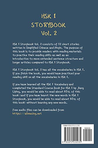 There is a new SECOND EDITION of this book – link – www.amazon.com/dp/B089TRY91C HSK 1 Storybook Vol. 2 consists of 12 short stories written in Simplified Chinese, with Pinyin and English translation. The purpose of this book is to provide readers with reading materials to practice their reading skills as well as an introduction to more extended sentence structure and longer articles compared to HSK 1 Storybook. The stories here are of course different compared to the stories in the first book. HSK 1 Storybook Vol. 2 has all the vocabularies in HSK 1. If you finish the book, you would have practiced your reading skill on all the vocabularies in HSK 1. I have tried to restrict the vocabularies used in this book to HSK 1 as far as possible. Where it is not possible, I have introduced limited new words in the story. If you have learned all the HSK 1 Vocabulary and completed the Standard Course Book for HSK 1 by Jiang Liping, you would be able to read around 85% of this book (and if you have learnt the new words in HSK 1 Storybook, you would be able to read around 95% of this book) without learning any new words. Text to speech function has been enabled for the e-book version. You may also download the audio files for free with the link and password provided on the last page. The password in this book will also give you access to other materials such as HSK Vocabulary Writing Practice Sheet (with stroke order) and printable HSK Vocabulary with audio files. Lastly, I am sorry to disappoint those who enjoy reading a book with pictures because this book has no picture, only words. For the rest who doesn’t like the distraction of pictures, I hope you will enjoy reading this book. If you have any feedback, please feel free to visit https://allmusing.net.