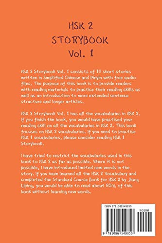 HSK 2 Storybook Vol. 1 consists of 10 short stories written in Simplified Chinese and Pinyin with free audio files. The purpose of this book is to provide readers with reading materials to practice their reading skills as well as an introduction to more extended sentence structure and longer articles. HSK 2 Storybook Vol. 1 has all the vocabularies and Grammar Points in HSK 2. If you finish the book, you would have practised your reading skill on all the vocabularies and Grammar Points in HSK 2. This book focuses on HSK 2 vocabularies. If you need to practise HSK 1 vocabularies, please consider reading HSK 1 Storybook.I have tried to restrict the vocabularies used in this book to HSK 2 as far as possible. Where it is not possible, I have introduced limited new words in the story. If you have learned all the HSK 2 Vocabulary and completed the Standard Course Book for HSK 2 by Jiang Liping, you would be able to read about 85% of this book without learning new words.Text to speech for this book has been enabled. You may also download the free audio files with the link and password provided on the last page.I consider the HSK 2 Vocabulary together with the new words introduced in Standard Course Book as Extended HSK 2 Vocabulary and I will refer to it as such from now on. The structure of this book is as follows:*Statistics – this will provide the reader with an analysis of the words used in the story and the level of difficulty. It will set out new words along with Pinyin and explanation. The new words set out here are not cumulative. New words are set out here as long as the words used are not in the Extended HSK 2 Vocabulary. *Story – this section is the story in Simplified Chinese without Pinyin and the English translation. To test level of reading skills, you should attempt to read this section first before going to the next.*Pinyin and Translation – this will be the section for Pinyin and English translation.*Appendix – for the benefit of those who need assistance on the HSK 2 and HSK 2 Standard Course vocabularies, I have included them in this section for your reference.The stories in this book are individual stories. A reader may choose to read this book in any particular order. To help you decide which story to read first, you may take a look at the statistics before you begin. The difficulty level for each story varies.