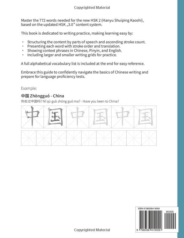 This essential workbook covers all 772 Chinese words required for the elementary level 2 of the recently updated proficiency test “HSK 3.0”, helping you to understand and memorize the vocabulary efficiently. This book is dedicated to writing practice, making learning easy by: Structuring the content by parts of speech and ascending stroke count. Presenting each word with stroke order and translation. Showing context phrases in Chinese, Pinyin, and English. Including larger and smaller writing grids for practice. A full alphabetical vocabulary list is included at the end for easy reference. Embrace this guide to confidently navigate the basics of Chinese writing and prepare for language proficiency tests.