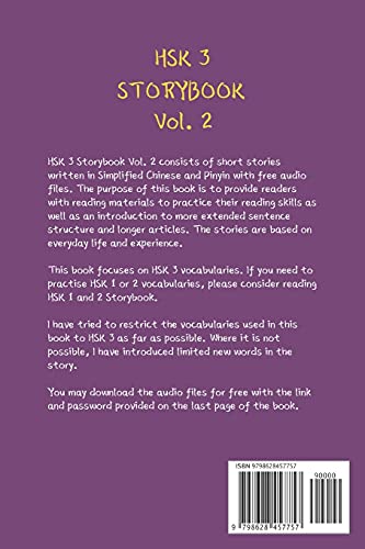 HSK 3 Storybook Vol. 2 consists of 5 short stories written in Simplified Chinese and Pinyin with free audio files. The purpose of this book is to provide readers with reading materials to practice their reading skills as well as an introduction to more extended sentence structure and longer articles. The stories are based on everyday life and experience. HSK 3 Storybook Vol. 2 has all the vocabularies and Grammar Points in the HSK 3 Syllabus. If you finish the book, you would have practised your reading skill on all the vocabularies and Grammar Points in the HSK 3 Syllabus. This book focuses on HSK 3 vocabularies. If you need to practise HSK 1 or 2 vocabularies, please consider reading HSK 1 Storybook and HSK 2 Storybook . Text to speech function has been enabled for the e-book version. You may also download the audio files for free with the link and password provided on the last page of the book.There are other free supplementary materials for this book such as HSK 3 Vocabulary audio file, HSK 3 Vocabulary Writing Practice Sheet and more available for download at www.allmusing.net